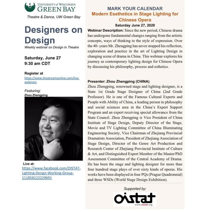 北京时间今天晚上22:30,受国际舞台美术组织OISTAT邀请,著名“灯光诗人”周正平将带来一场网络直播讲座,向世界舞美同行介绍中国戏曲舞台灯光艺术。