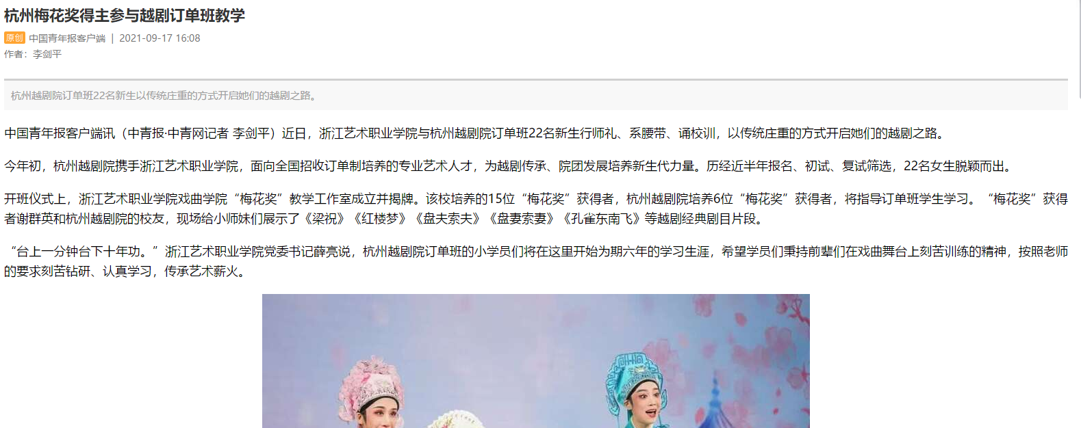 中国青年报:杭州梅花奖得主参与越剧订单班教学