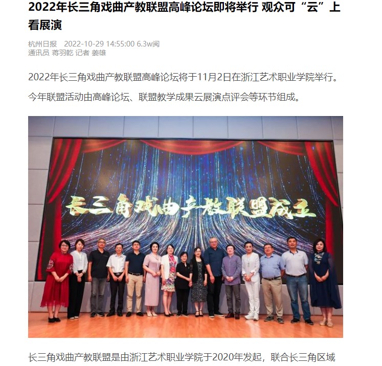 杭州日报:2022年长三角戏曲产教联盟高峰论坛即将举行 观众可“云”上看展演
