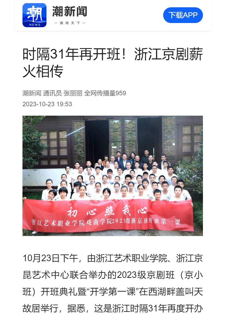10月23日下午,由浙江艺术职业学院、浙江京昆艺术中心联合举办的2023级京剧班(京小班)开班典礼暨“开学第一课”在西湖畔盖叫天故居举行,据悉,这是浙江时隔31年再度开办京剧表演艺术专业订单班。50名小小京剧人行拜师礼、接练功带,以奋进之姿赓续浙江京剧薪火。
