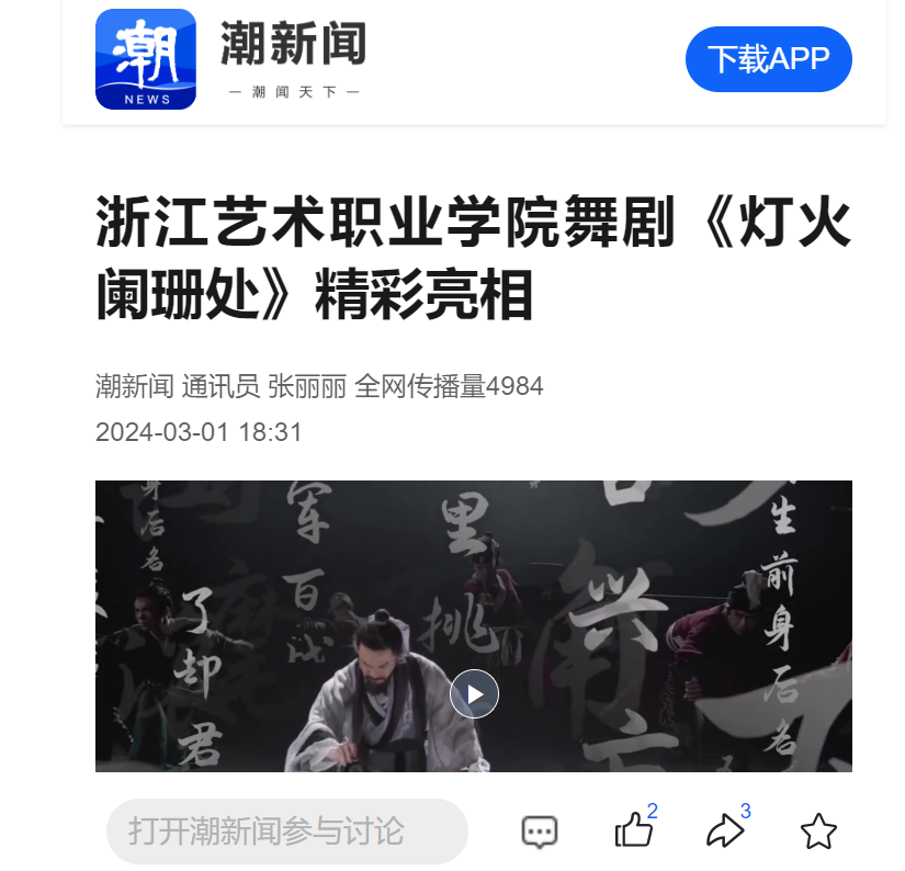 2月29日晚,武林广场的杭州剧院内,随着音乐的响起,灯光也跟着音乐的节拍闪动,舞剧《灯火阑珊处》在这里亮相。该剧由浙江文化艺术发展基金资助项目、浙江艺术职业学院出品。