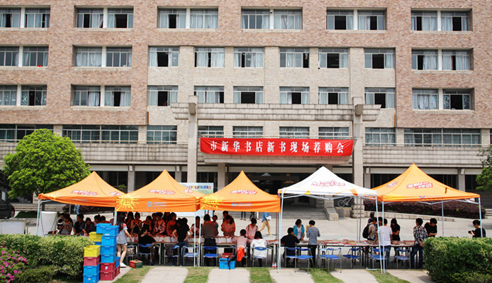 写着“市新华书店新书现场荐购会”的大红幅高高挂在八号楼楼上,吸引着同学们积极参与到“你选书,我付费”活动中。