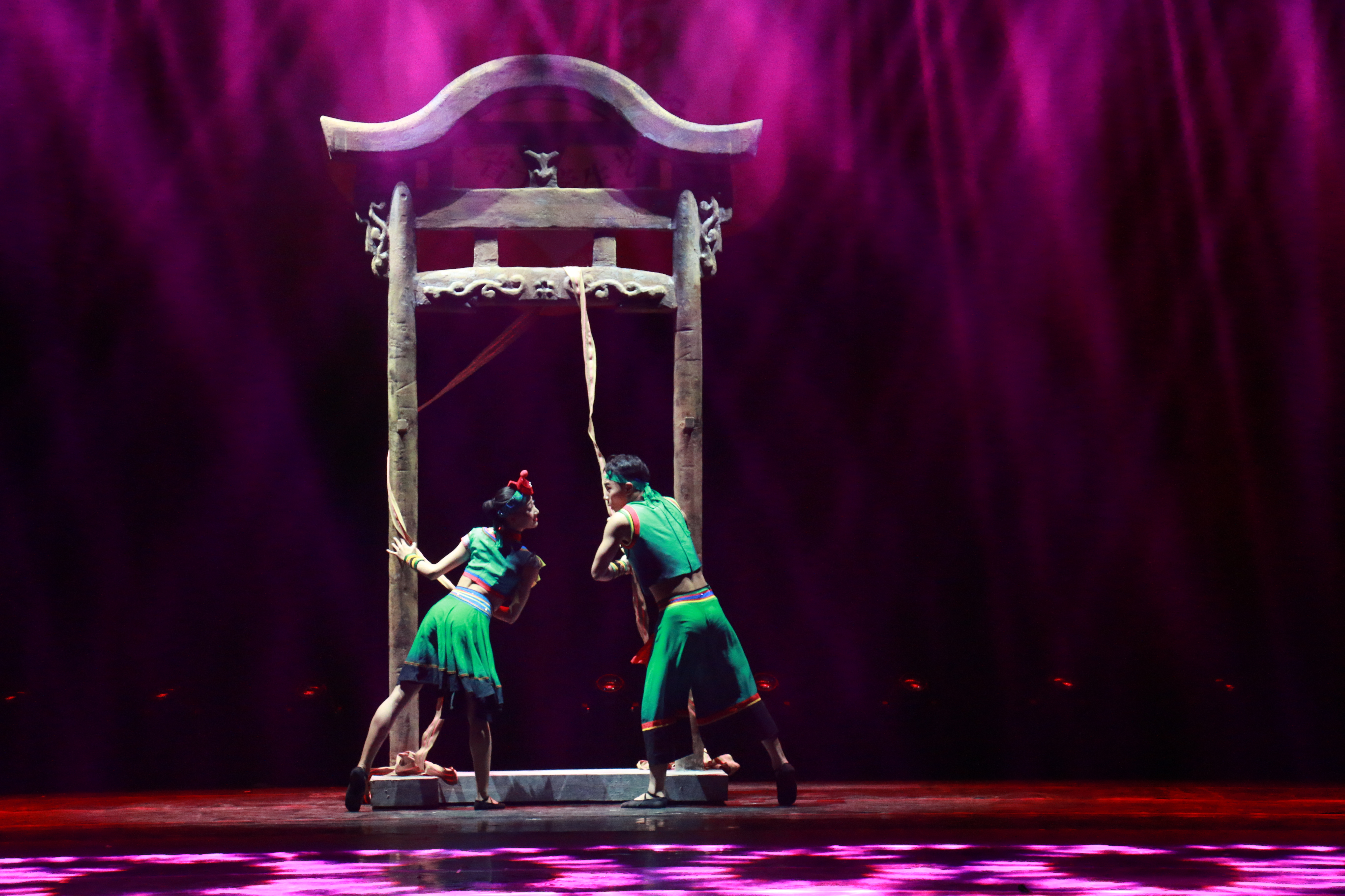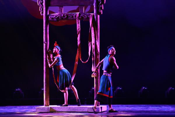 浙江艺术职业学院师生排演的《彩带•情歌》1日晚展演。舞蹈以一对青年男女的爱情为主线,以一条彩带为纽带,上演了一场幸福又缠绵的爱情故事。专业的表演技巧和细腻的情感表达,使观众感受着他们的甜蜜与缠绵。整段舞蹈在他们相拥的动作中定格,掌声由心而发。