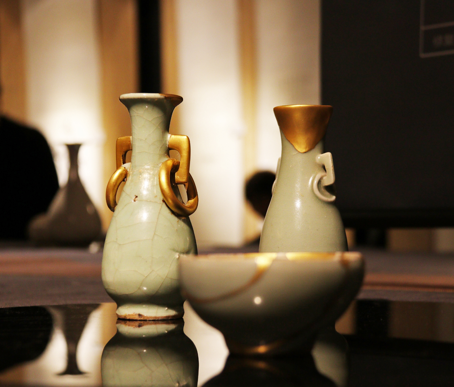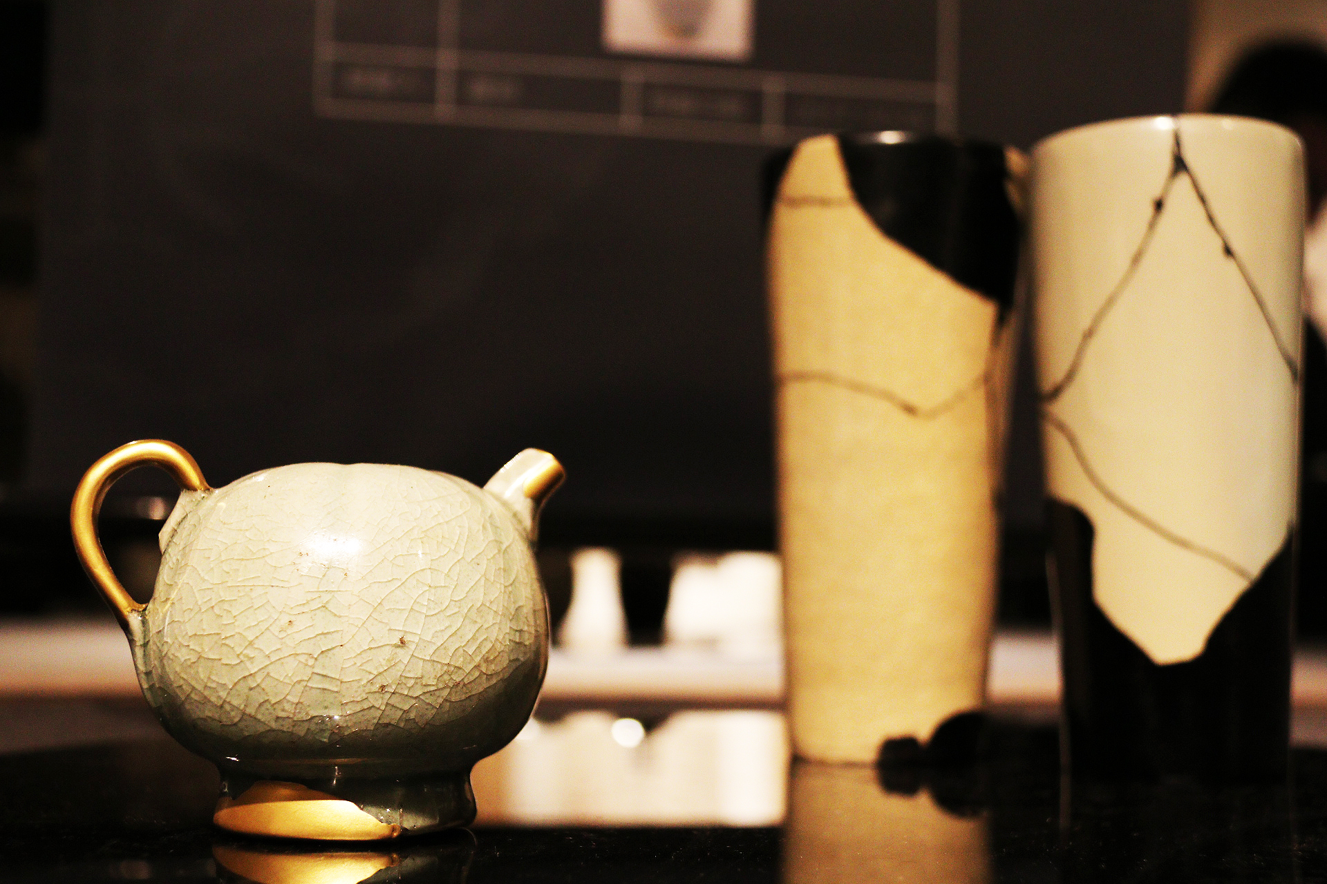 瓷器修复组的同学在指导老师朱伟洁、徐佳颖的指导下,取得了“妙手回春”的成果。同学们的作品展示了三种修复手法:石膏修复,大漆修复,金缮修复,石膏修复最为基础,金缮与大漆修复是起到一定美化作用的艺术性修复。首先根据功能用石膏或瓦灰等可塑性强的材料来塑造瓷器造型,打磨平滑,使其硬度、光滑度接近器物本身,再以黑漆、金粉、银箔等材料加以修饰。
