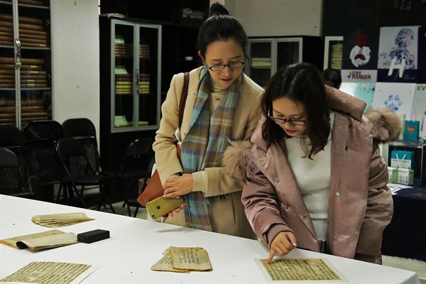 古籍修复组又分为两个部分,一个是新书装帧,一个是古籍修复。新书装帧有五种类型:金镶玉、线装、包背、蝴蝶装、毛装。新书制作好后,还有一套函套包起来,便于保管。其中还展示了装书过程。接着就是修复部分,展品中有许多修复成品,修复的过程也作为本次展览的展示,古籍修复与古画修复有点相似,都是比较复杂的工作。