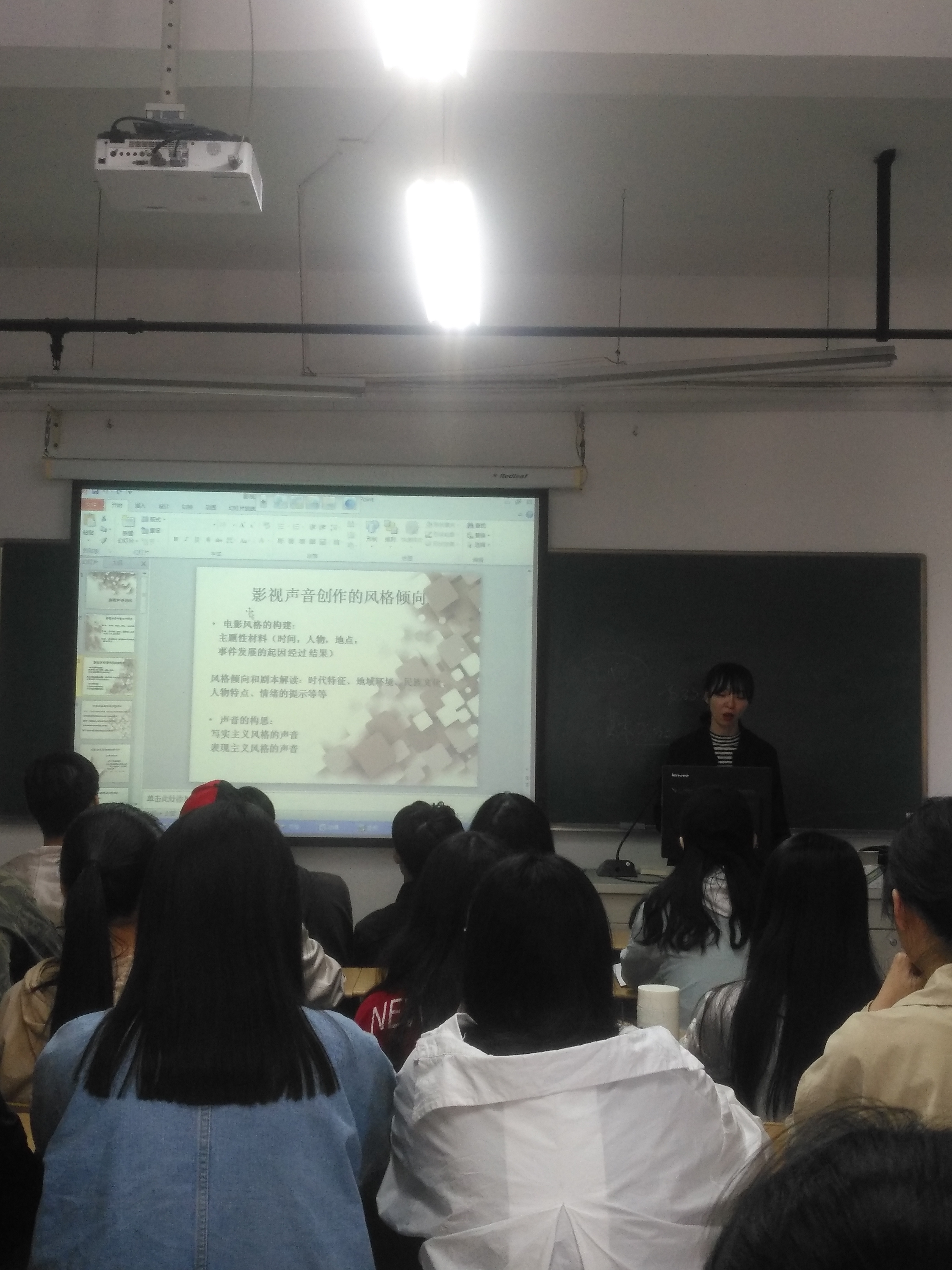 在理论基础课程展示方面,老师们十分重视专业基础课程的课堂活跃度及同学们对于基础知识的接收理解度,在课程展示过程中运用了较多的PPT色彩效果、课堂小道具以及简单易记忆的理论知识梳理方法来提升理论基础知识的课堂效果。王芳老师的《音响技术》通过教学案例、校内外展演、户外课堂看展多元化理论与实践相结合的授课形式提升整体知识的吸收;黄洁慧老师将《网页色彩基础》的色彩课程与教学PPT进行了紧密契合的呈现,通过PPT各种色块的组合展现来简单易懂的道出HSB色彩三要素在日常网页色调运用时的作用;刘慧老师的《视听语言》课程通过手工制作笼子与鸟的图片道具,现场展示视觉滞留所产生的电影成像原理;芦辰芳老师的《电影评论》课程以时间及人物作为贯穿课程的电影发展史线索,用连贯记忆的方式引导同学们对于电影史的发展有一个浅入深出的理解。