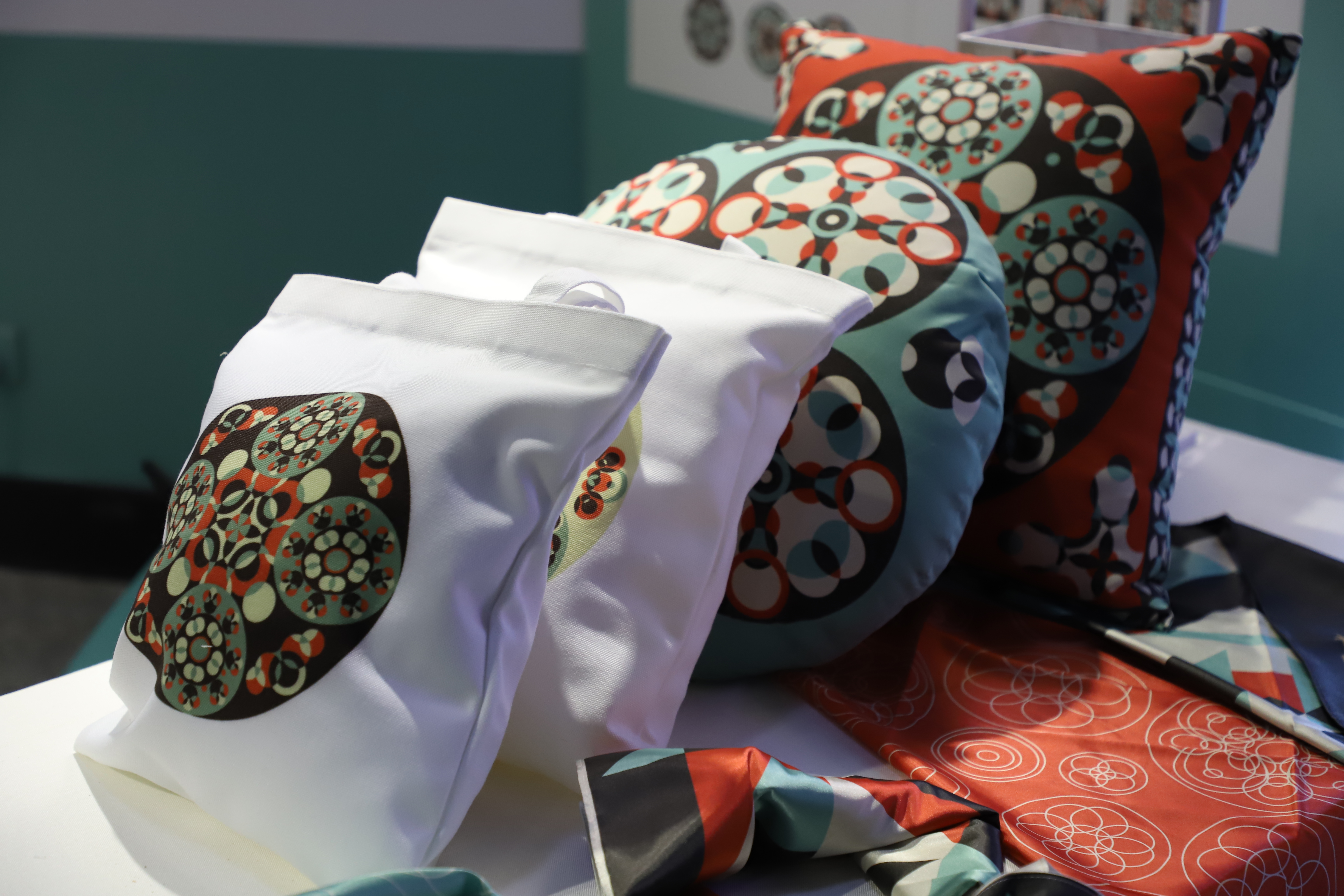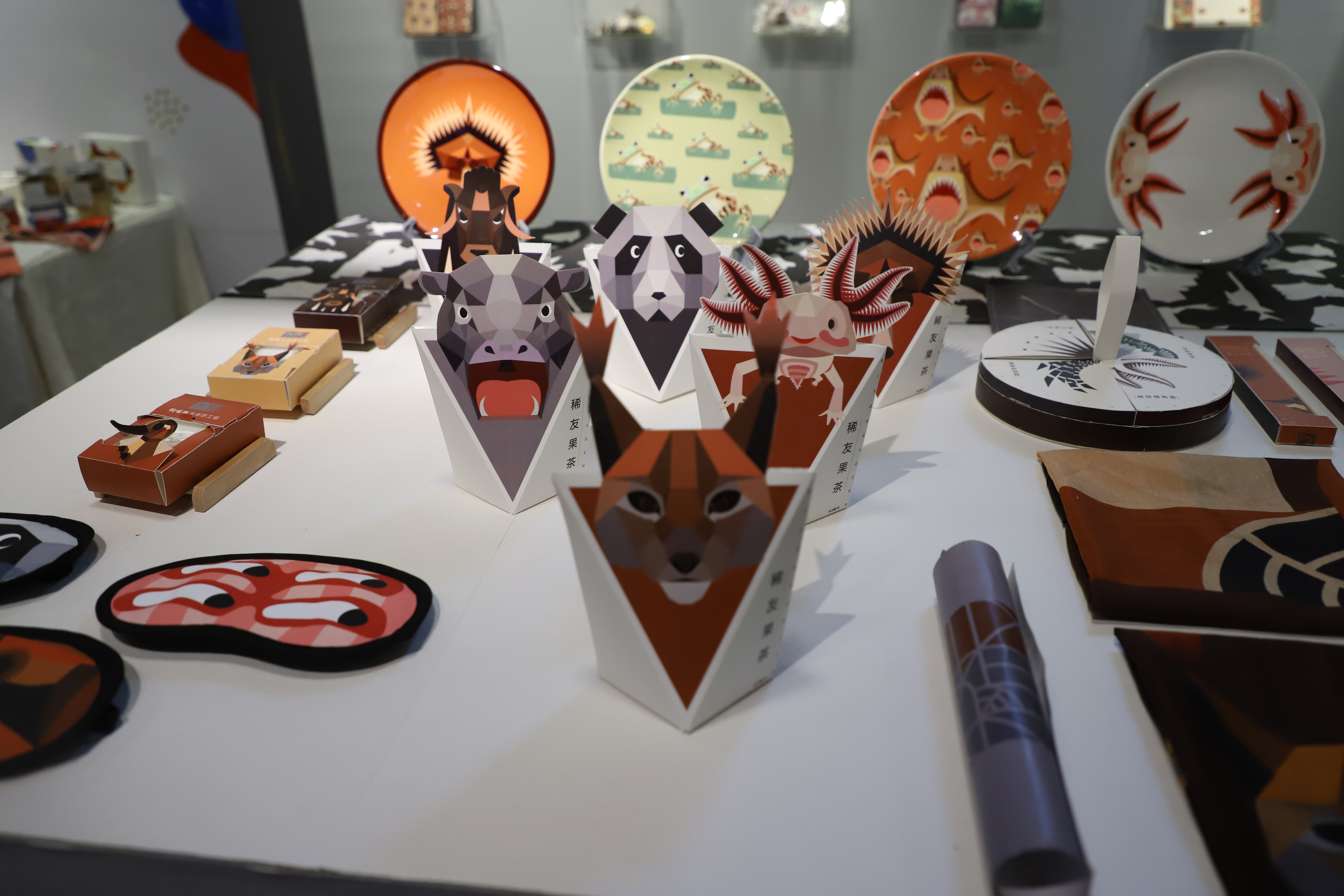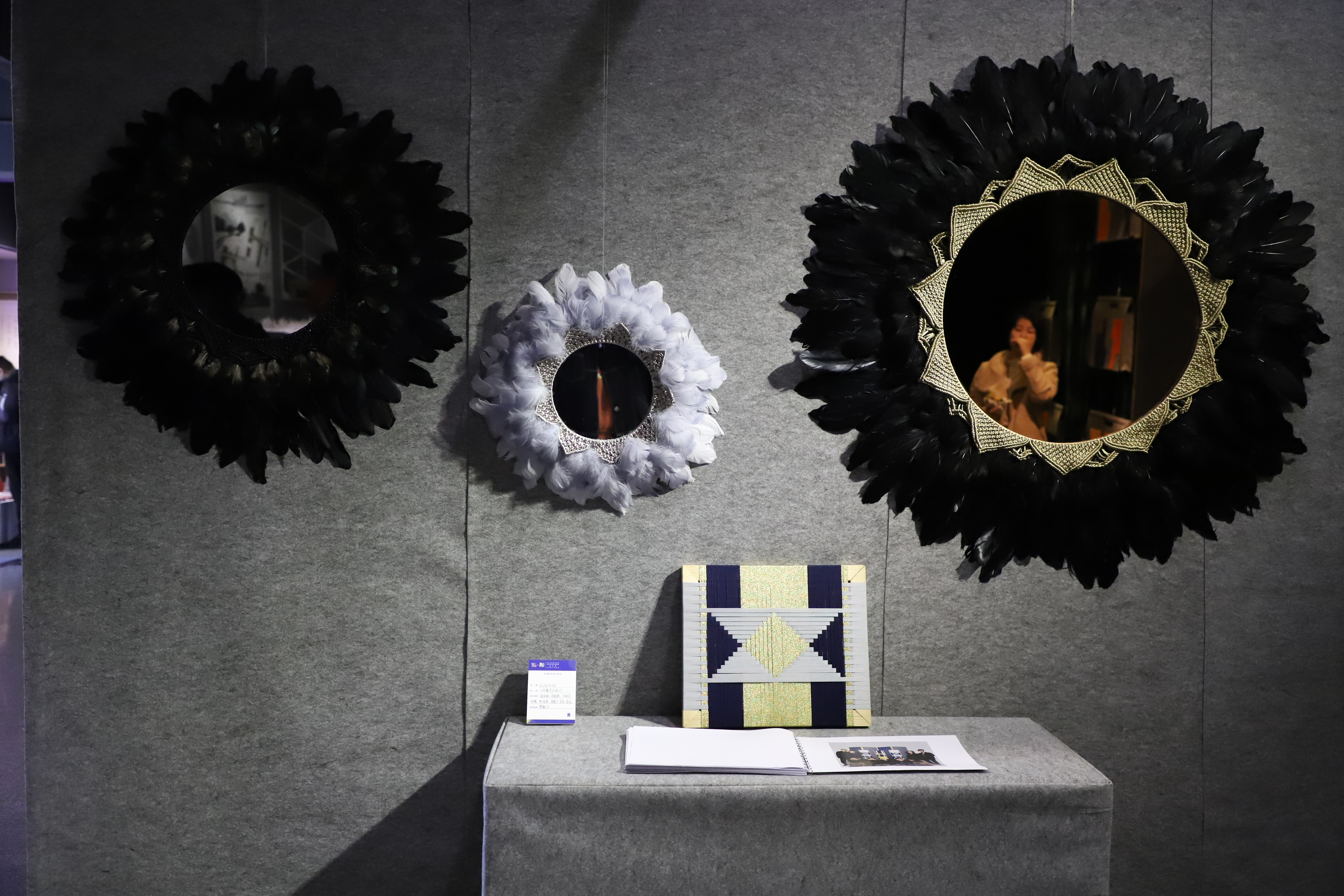 展览现场观众络绎不绝,16级的毕业生不仅拥有过硬的专业能力,还把作品转化为产品,很多产品在展览期间就已被预定。广告设计专业的同学有用敦煌藻井作为灵感来源的,有借鉴古老玉器纹样再创造的,纹路新颖,还有以健康养生、保护稀有动物、“拥抱”等为主题。环艺专业的作品有以神话故事——鲲鹏为背景的模型,造型立体、精细,有以颜色大胆、新颖、结构日式为主的家具、屏风,有要展现现代女性独立自强一面为主题的空间设计,还有民宿、新中式家具等等。