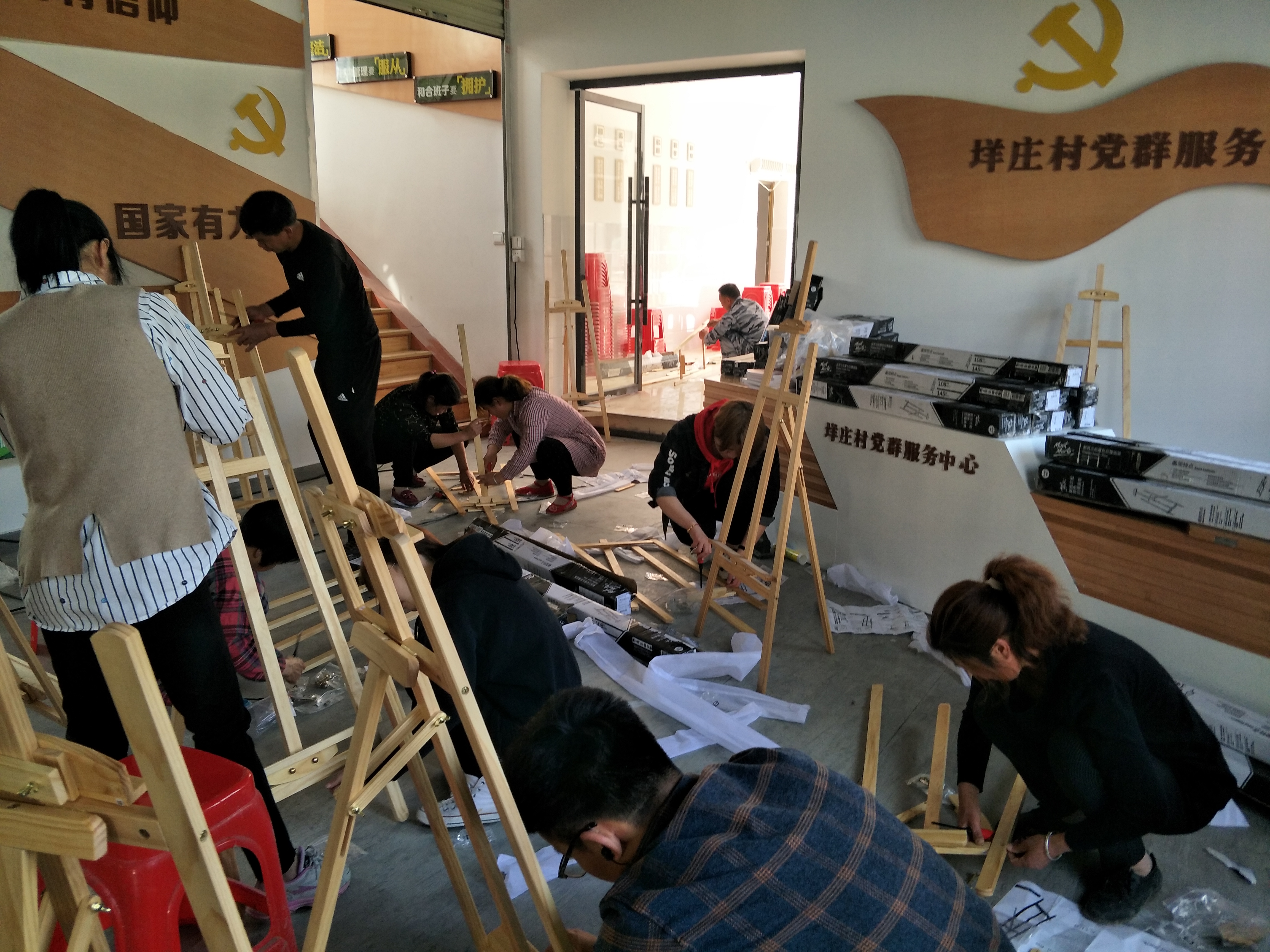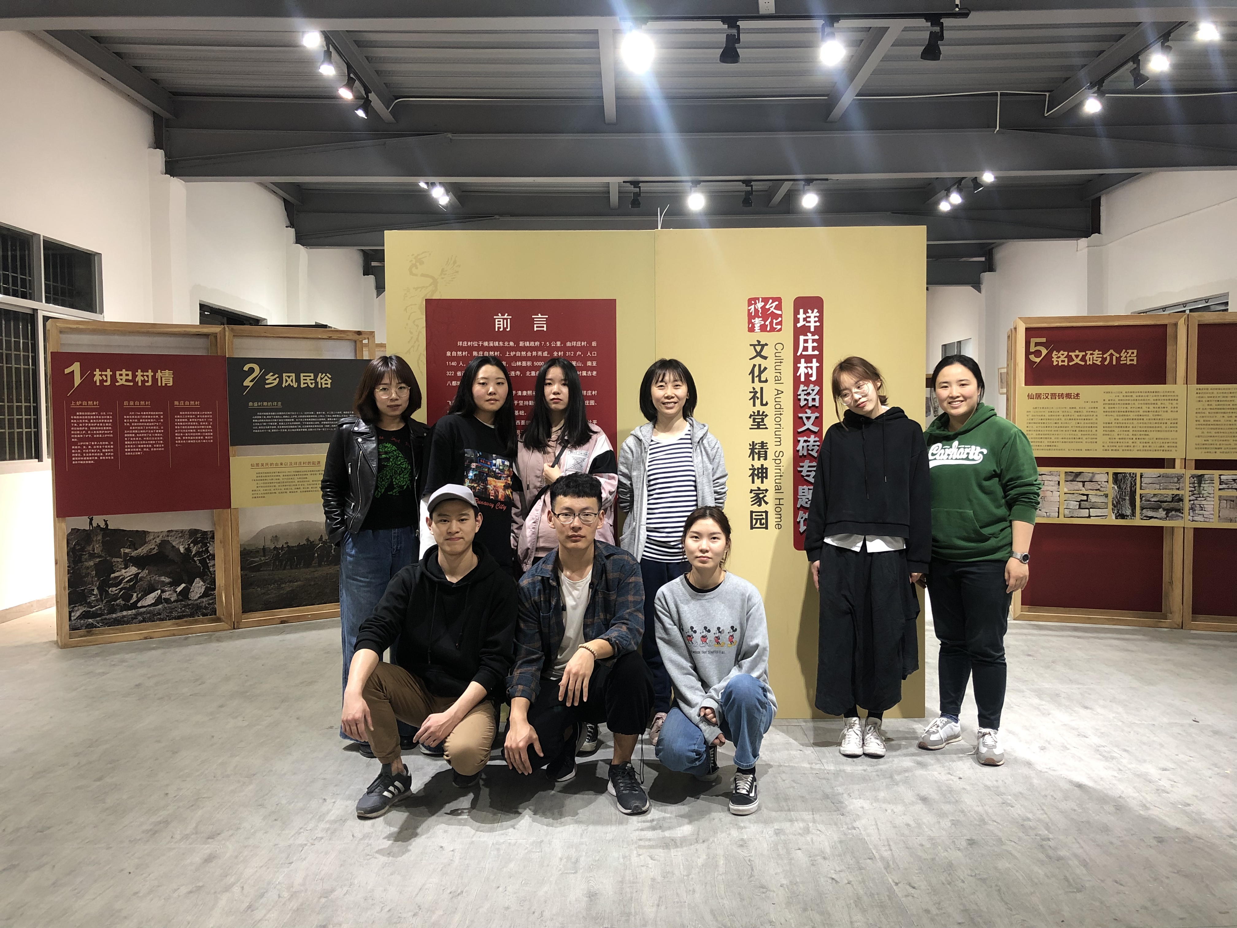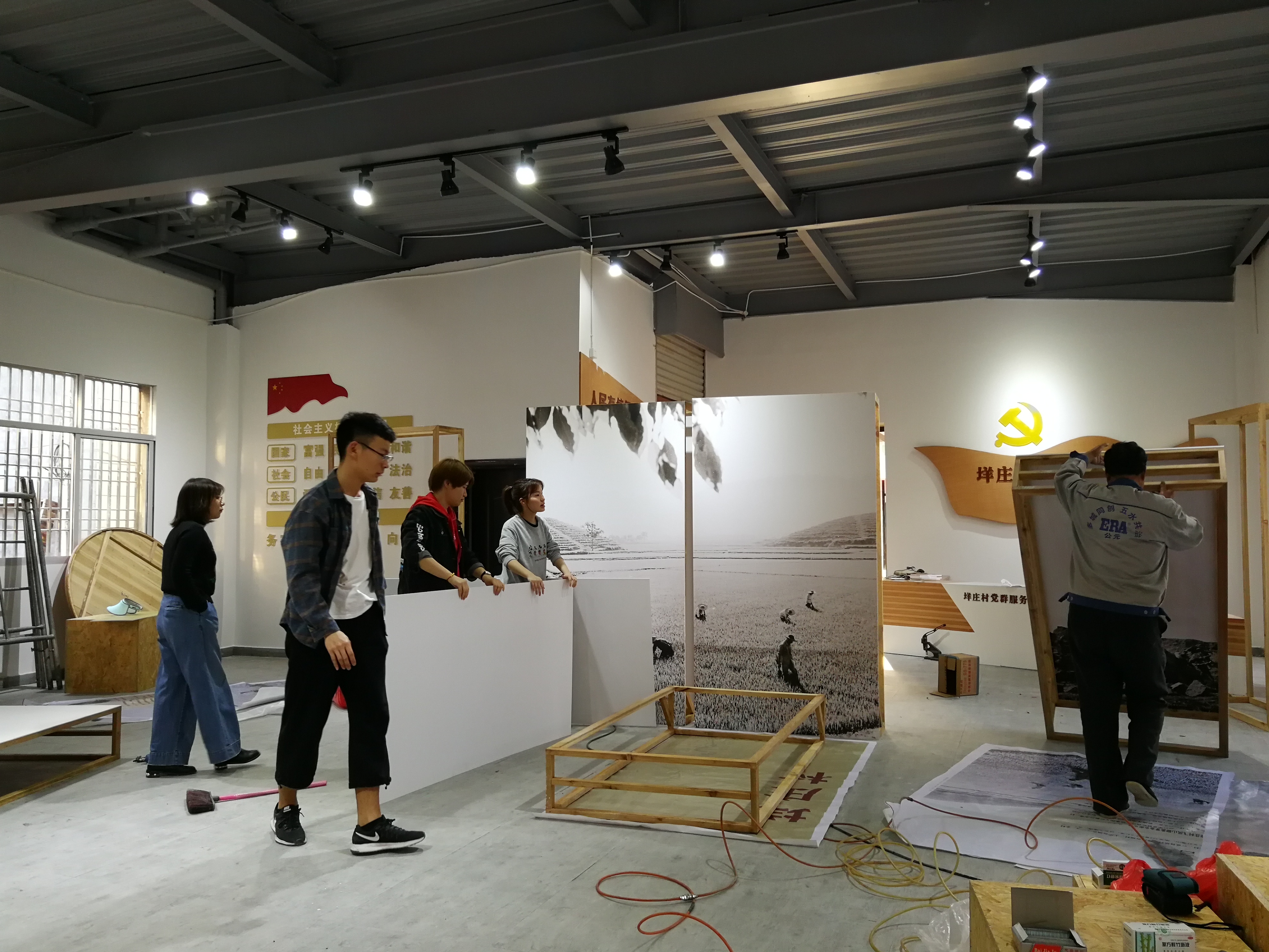 次日,展板的定稿,大家都进入了快节奏的布置环节。晚上10点所有展板从加工厂运输到现场。尽管已是深夜,大家齐心协力奋战,与工人师傅配合将展板一一装置完成。凌晨,垟庄村文化礼堂建设工作完美收工。高强度工作的两天里,没有一个人松懈。