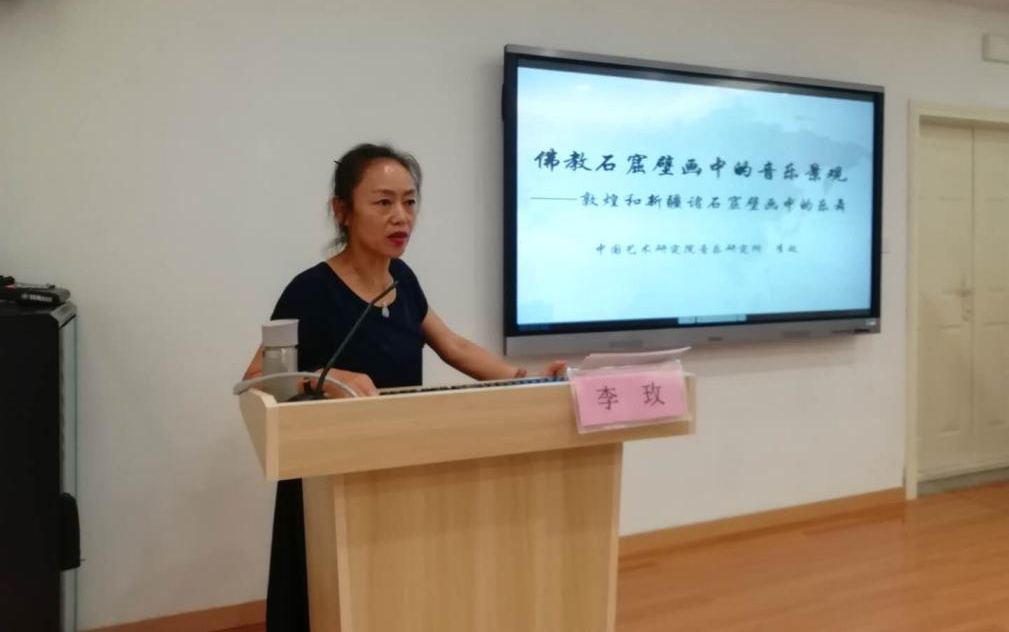 讲座伊始,李玫研究员从“文化诗学”与“艺术图像学”的视野出发,提出对于艺术作品要进行两种阅读:品质阅读与价值阅读,通过作品的语言来寻找意义。通过敦煌石窟和新疆克孜尔石窟壁画中的音乐元素,来说明古人如何用造型艺术语言来表达音乐方面的内容,并提出艺术语言的表达意义方面形成了相对具体的艺术媒介语言的技巧和规律。佛教石窟壁画的沧海桑田,足以显见音乐在当时、当地、以及佛教发展过程中的重要作用。这些乐舞壁画为我们研究中西音乐文化交流、佛教音乐的东传提供了重要的实物资料,具有不可替代的学术价值。
