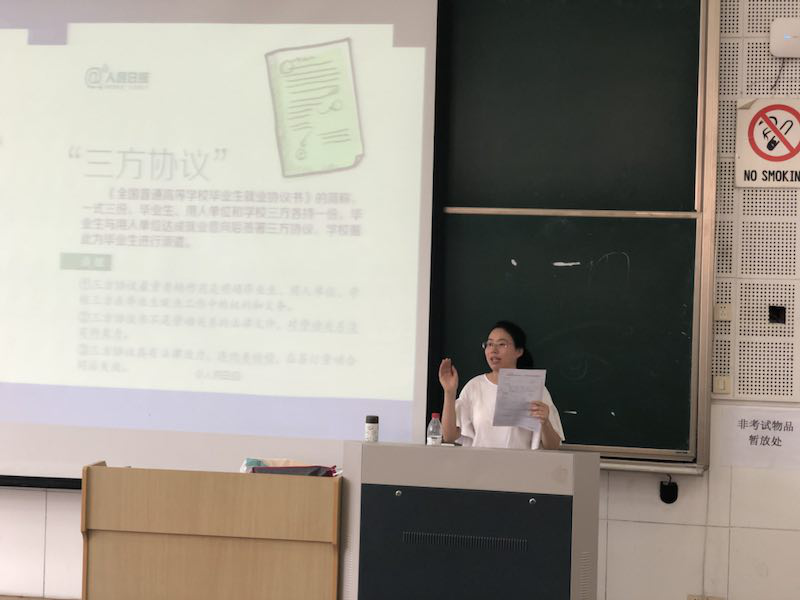 陈丽丽对毕业生就业材料、就业手续、毕业生派遣等做了详细介绍;对就业推荐表、三方协议、报到证、档案、户口、二次派遣等做了逐一解读;对毕业生落户手续、就业手续办理等回答了毕业生提问;对毕业生具体派遣流程和重点注意事项使提供了清晰解答。