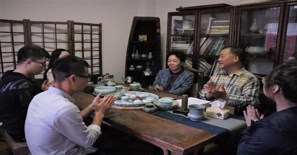 授牌仪式结束后,文化管理系师生一行前往龙泉市古玩市场拜访了毕业后一直从事青瓷行业的校友—07文鉴班校友刘志勇。谢青代表文化管理系向刘志勇表达了母校的问候与关心,并介绍了文化管理系近几年来的专业建设与取得的成绩,刘志勇回顾了在校期间的学习与生活,向学弟学妹们分享了自己在从事青瓷相关行业工作中的努力、成就与困惑,阐述了对未来职业的规划和专业愿景,并表达了对母校培养的感谢。