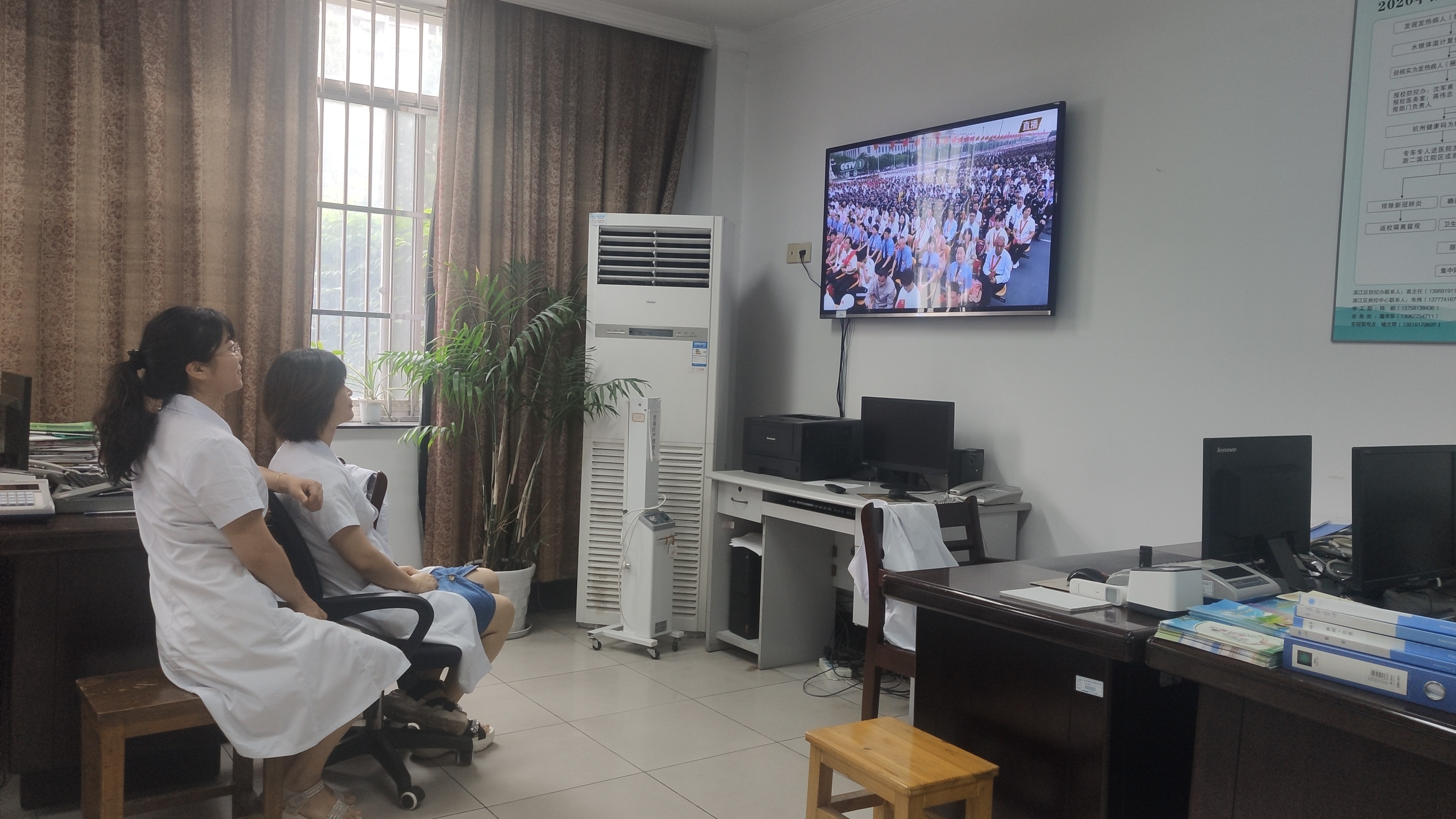 8点整,教职工们准时聚集在1108会议室,观看激动人心的历史时刻,另有工作安排的食堂师傅们、车队师傅们和值班医生们也在他们的岗位上用手机收看了此次直播。