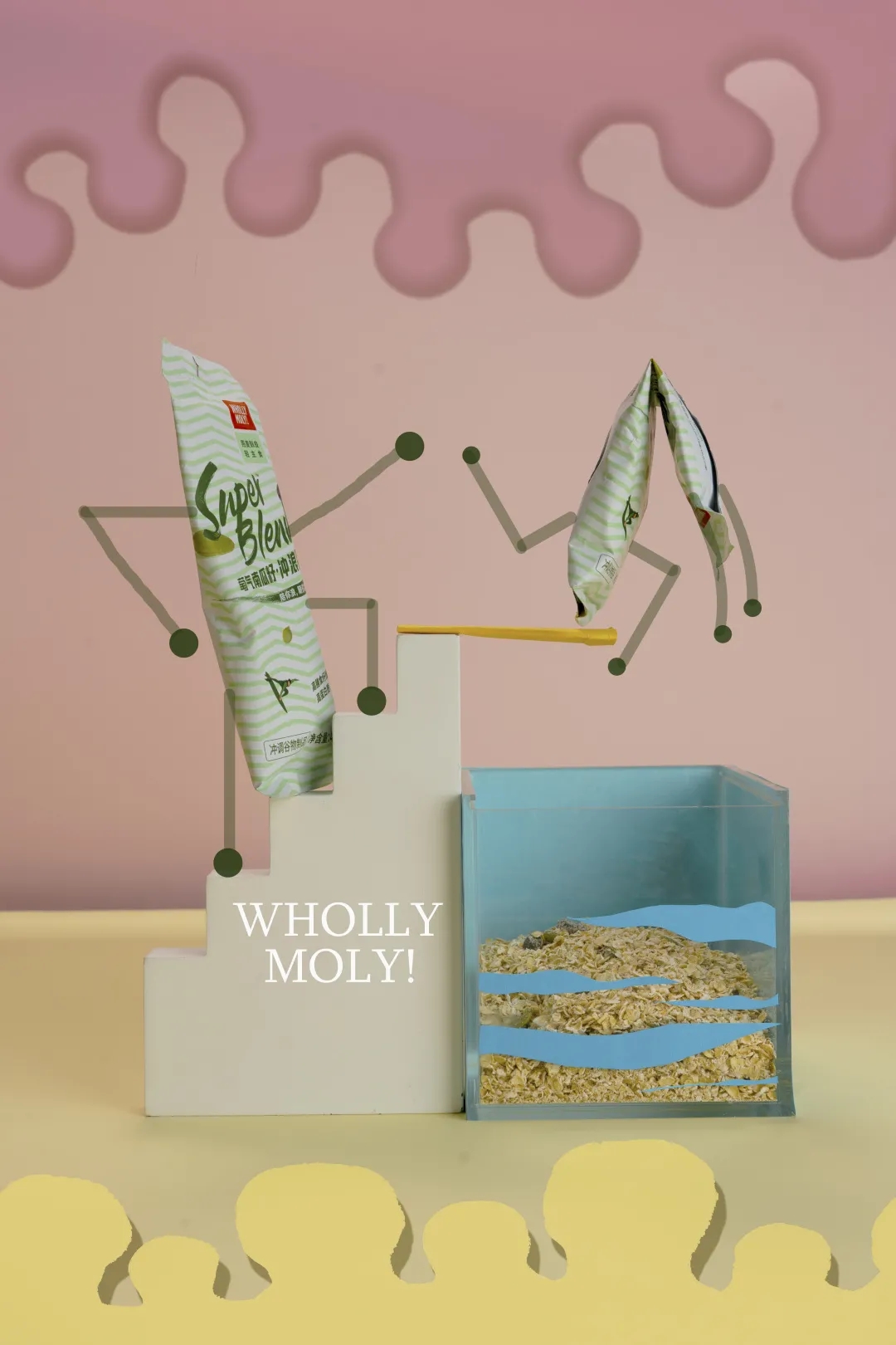 作品阐述:本产品是好哩品牌下的一款代餐谷物饮品,名为萄气南瓜籽。在拍摄上选择了拟人化的手法,将产品设置在海滩、城市、跳台、草地四个场景,并结合每个场景设置人物情节,通过置景和后期手绘的方式去实现动态感和拟人化,从而达到提升趣味性的效果,符合品牌年轻受众群体的目标。