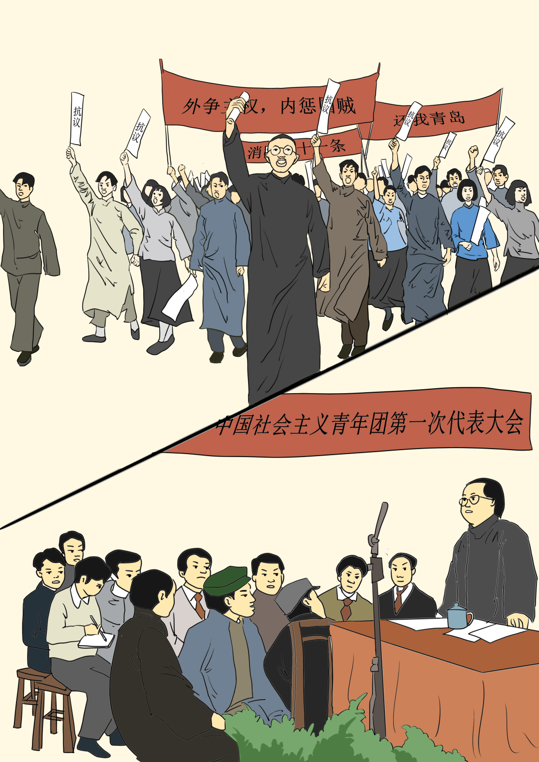 微团课后,播放影视作品《觉醒年代》。该片以1915年《青年杂志》问世到1921年《新青年》成为中国共产党机关刊物为贯穿,展现了从新文化运动、五四运动到中国共产党建立这段波澜壮阔的历史画卷,讲述了觉醒年代社会风情和百态人生。