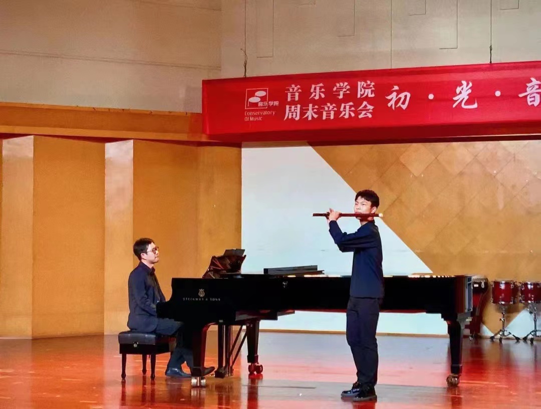 笛子独奏《婺江欢歌》由18小音乐班王涵演奏,作品以浙江婺江音乐为素材描绘了婺江两岸春意盎然的景色,体现了人们生活的美好和幸福。在演奏技巧上将循环换气和连续颤音结合使用,更丰富的表现了泛彩流金的滚滚江水和欢乐人群的动人场面。