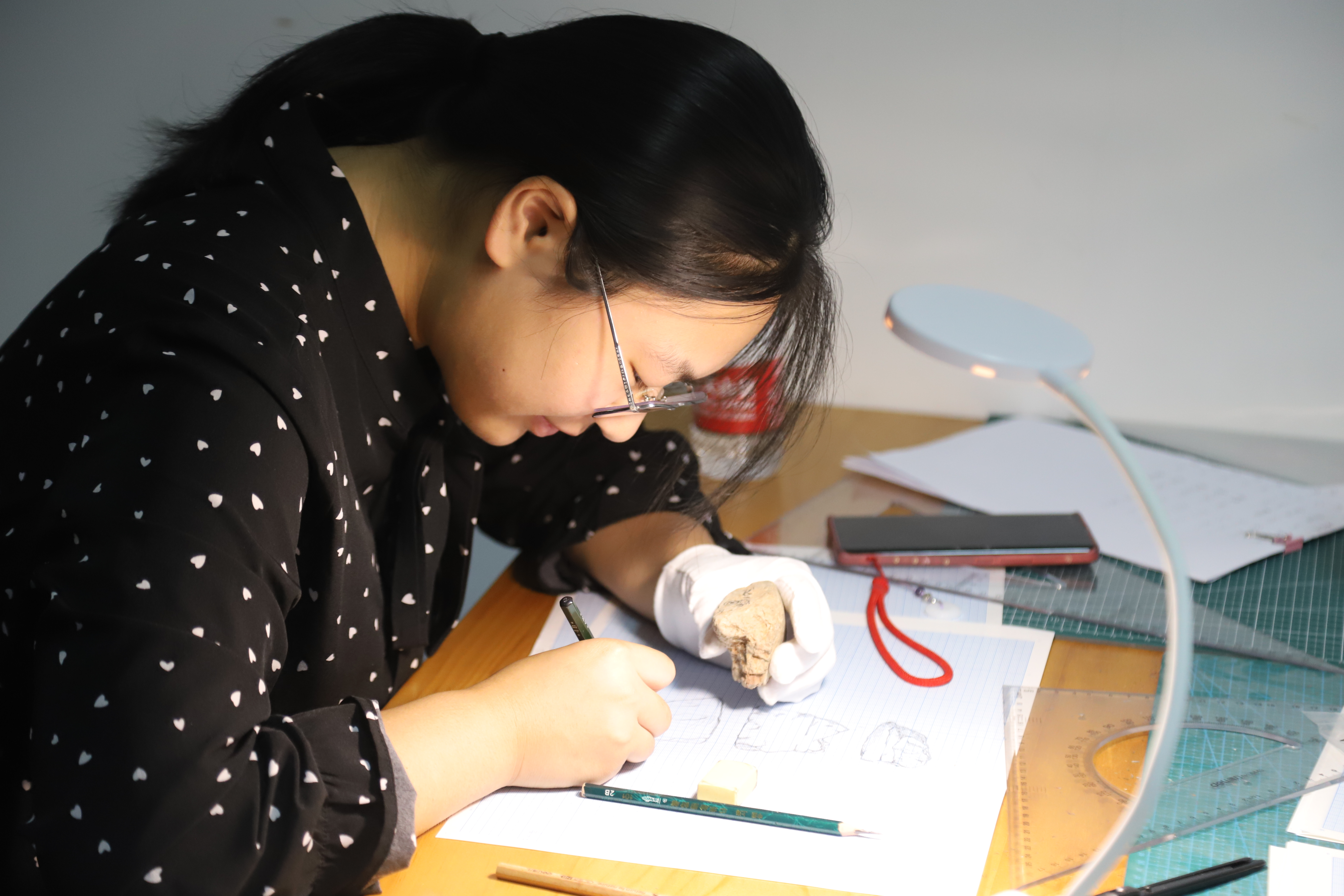 团队成员共计9人,分成绘图组和摄影组,大家各司其职、通力合作。绘图组组员使用测量工具精准测量文物尺寸并手绘记录,由于每样文物的形制、出土状态和材质的不同,在记录过程中运用不同的处理方式,每一件文物都需要团队成员集中精力有序协作完成。