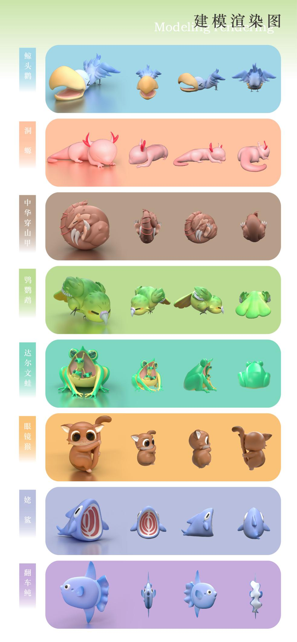 设计说明:大自然创造了许多美丽可爱、富有灵气的生命,但随着社会的极速发展,大量的生灵由于自然灾害、人类经济活动、栖息地的急剧变化、猎杀等原因濒临灭绝,令人痛惜。本主题以濒危动物保护为切入点,采用多元化的手法重塑濒危动物形象,通过文创设计的形式向大众普及濒危动物知识。作品通过抽象几何风格的海报、卡通萌系插画、动物信息科普可视化图表、live2D游戏互动、3D角色盲盒等表现形式,将二维与三维多媒体技术结合,以丰富新颖的视觉表现形式来呼吁社会对该话题的关注。