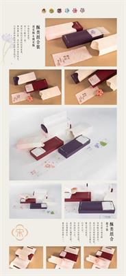 设计说明:本课题项目以宋韵文化为背景,打造了一个中式茶点自创品牌——“宋茗果”。在包装材料上选择可塑性较强且环保的纸浆,运用纸浆塑型工艺制作包装容器,提高了保护性和可重复使用性。纸浆有明显的肌理感,搭配一系列从宋代五大窑中提取的色彩,如“暮山紫”“西子”等,使包装有古朴素雅的质感。包装主要盒型有四种:天地盖和抽拉式的中包装,以食盒为原型的小礼盒装和抽屉式的大礼盒装。此外根据宋代四艺,还制作了建盏、焚香盒、花瓶等衍生品,使人们感受到宋代独具韵味的生活美学。