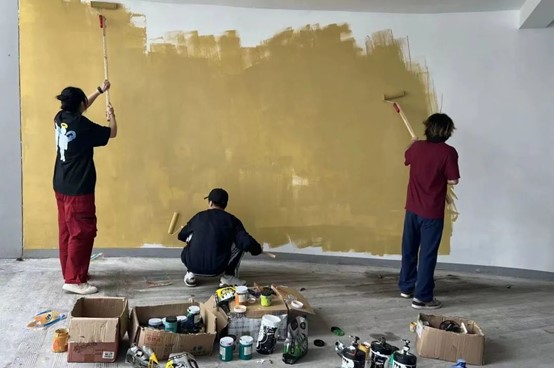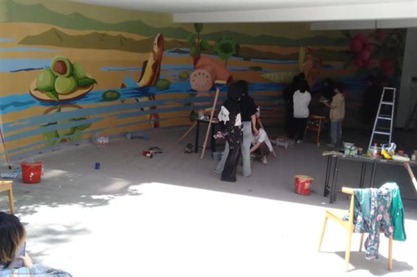 设计学子利用五一假期时间,积极投身于墙绘活动中,每一种颜色的调和,每一笔线条的绘制,看似轻松实则不易。迎着晨风,披着晚霞,同学们表现出了极大的创作热情,展现了坚韧不拔、无畏困难、吃苦耐劳、精益求精的专业素养和精神品质。