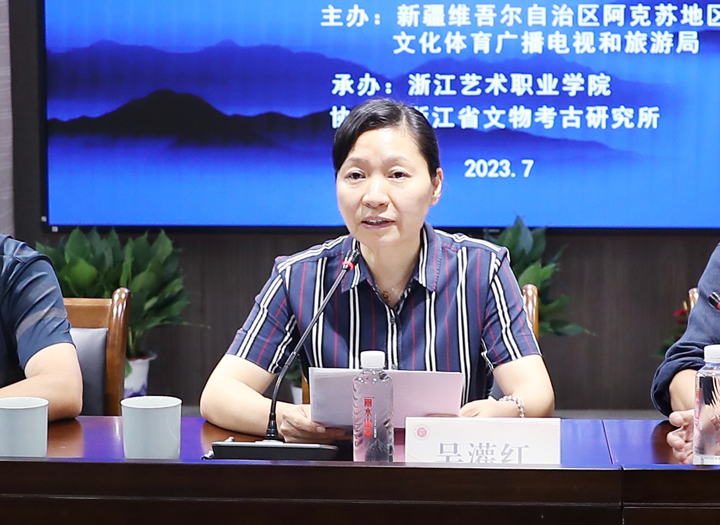 阿克苏地区文博院副院长艾斯克尔·阿巴斯,浙江艺术职业学院继续教育学院党支部书记、副院长吴灌红,浙江省文物考古研究所副所长郑嘉励出席开班仪式并讲话,阿克苏地区文博院副院长楼杰主持开班仪式。