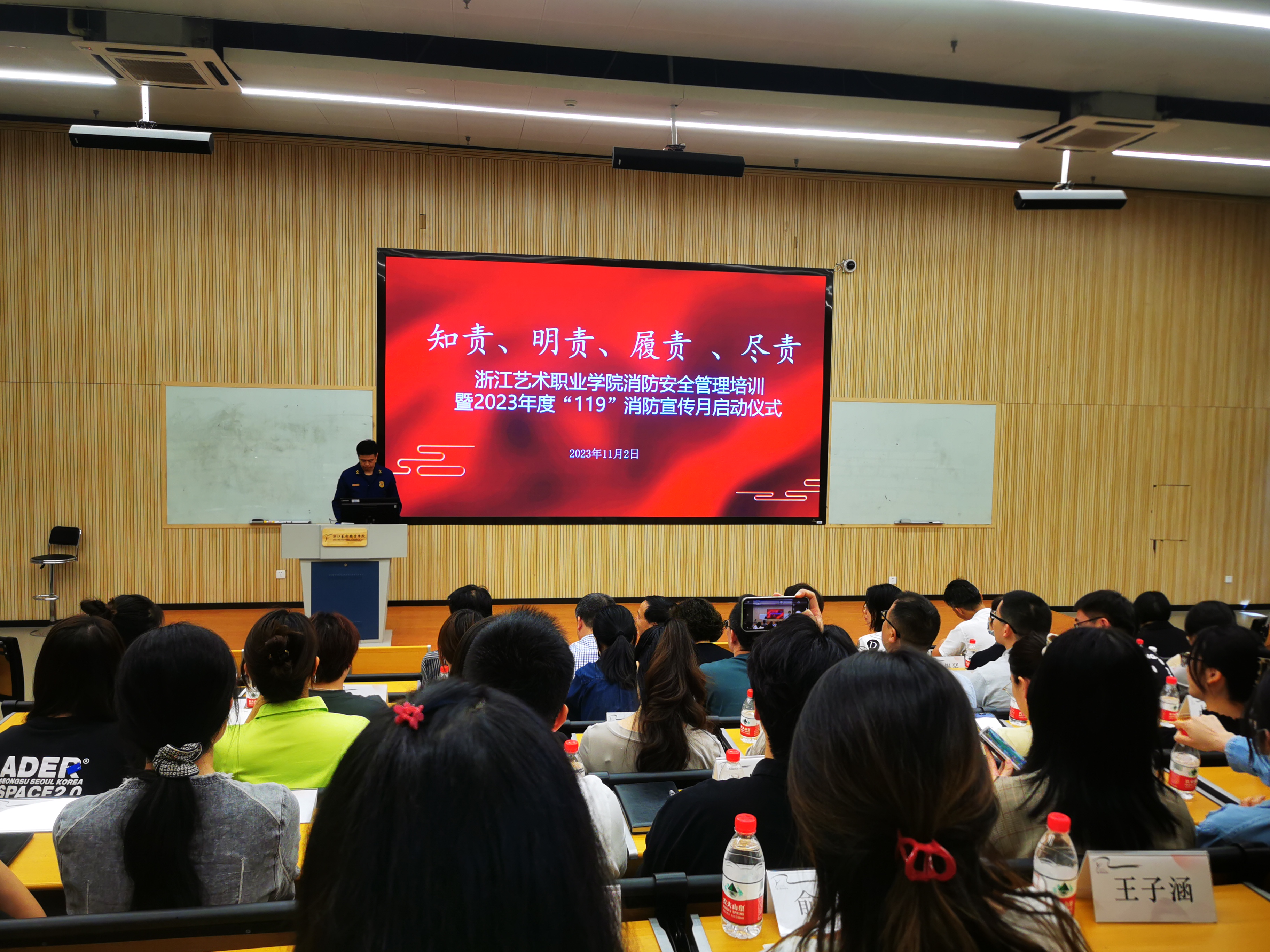为进一步提高学校消防安全管理人员消防安全意识,维护校园安全稳定,11月2日,保卫处组织开展了全校性的“知责、明责、履责、尽责”主题消防安全培训工作。滨江区消防救援大队副大队长章一立作专题分享。校党委领导班子出席,校属各部门主要负责人、2023年新进教职工参加。活动由保卫处副处长张志扬主持。