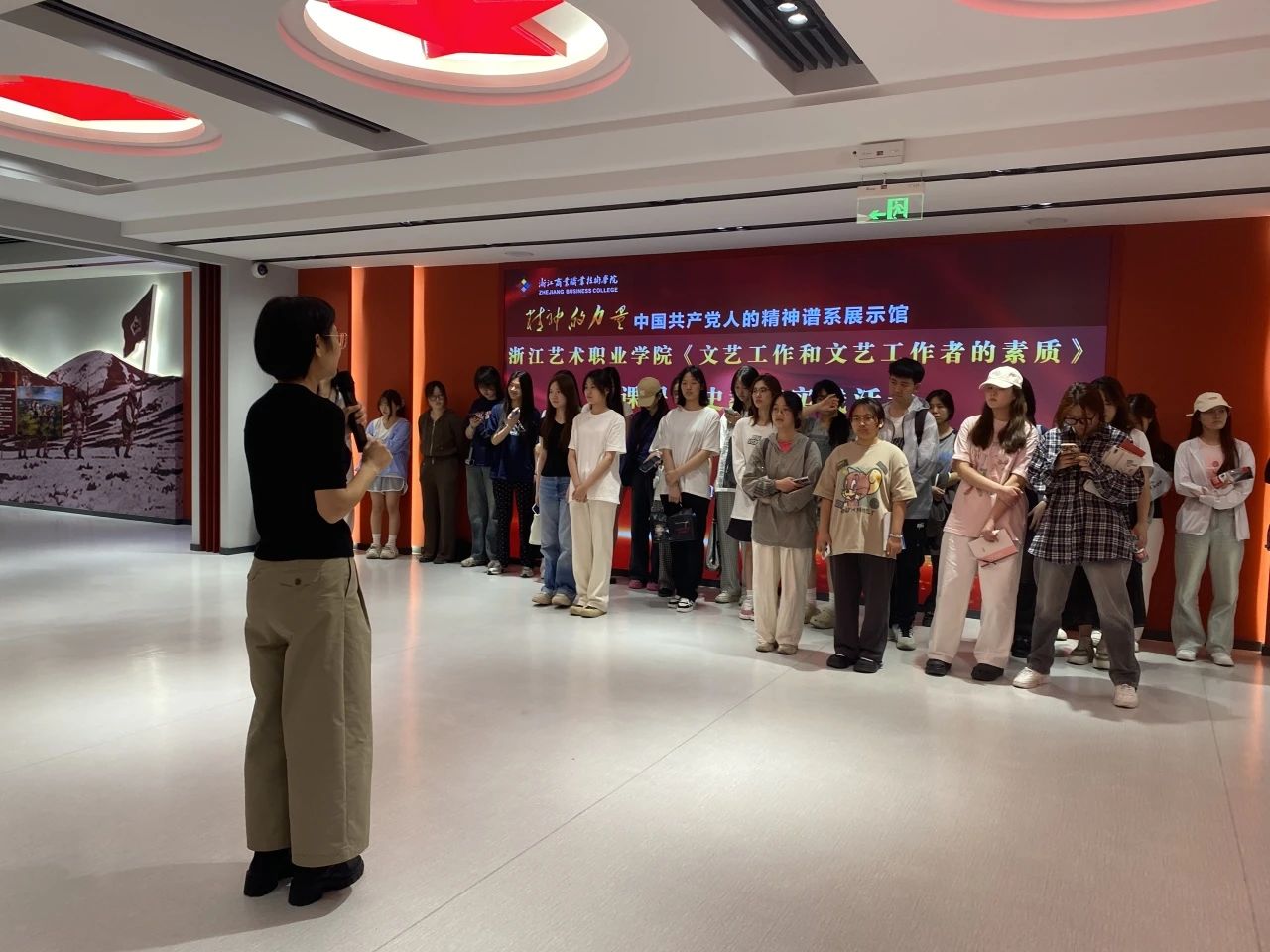 5月22日,《德艺双馨——文艺工作和文艺工作者的素质》课堂上的30余位同学在马克思主义学院直属党支部书记、院长王筱芽的带领下,走进浙江商业职业技术学院“精神的力量——中国共产党人的精神谱系展示馆”上了一堂党史教育现场教学课,以红课润心,在红馆启航,共话中国共产党百年奋斗的伟大历程,探寻百年大党永葆青春的精神密码。