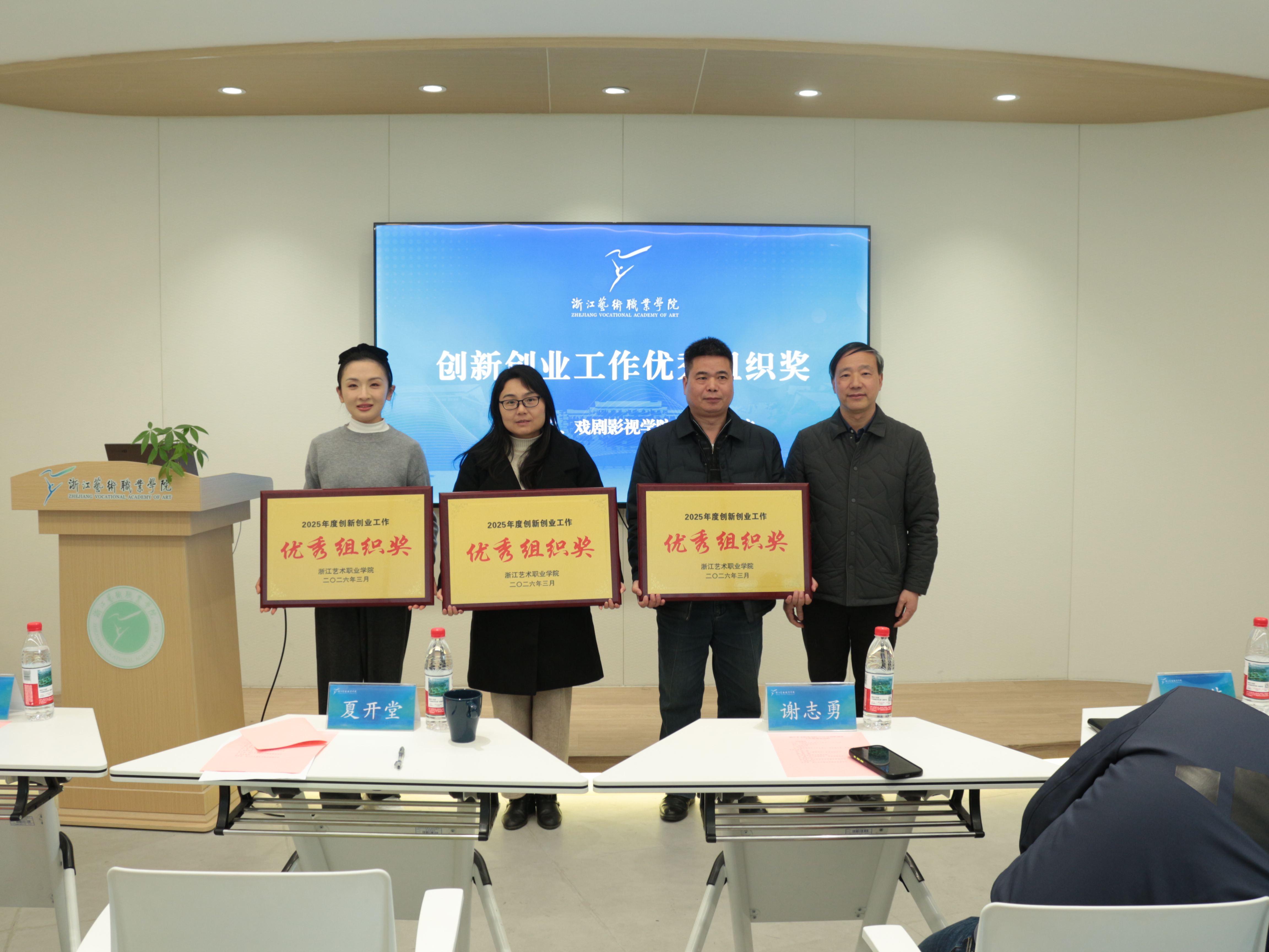 夏开堂宣读了浙江艺术职业学院2025年度创新创业表彰名单,并为年度“创新创业之星”“创新创业优秀指导教师”“创新创业工作优秀组织奖”获奖代表颁奖。