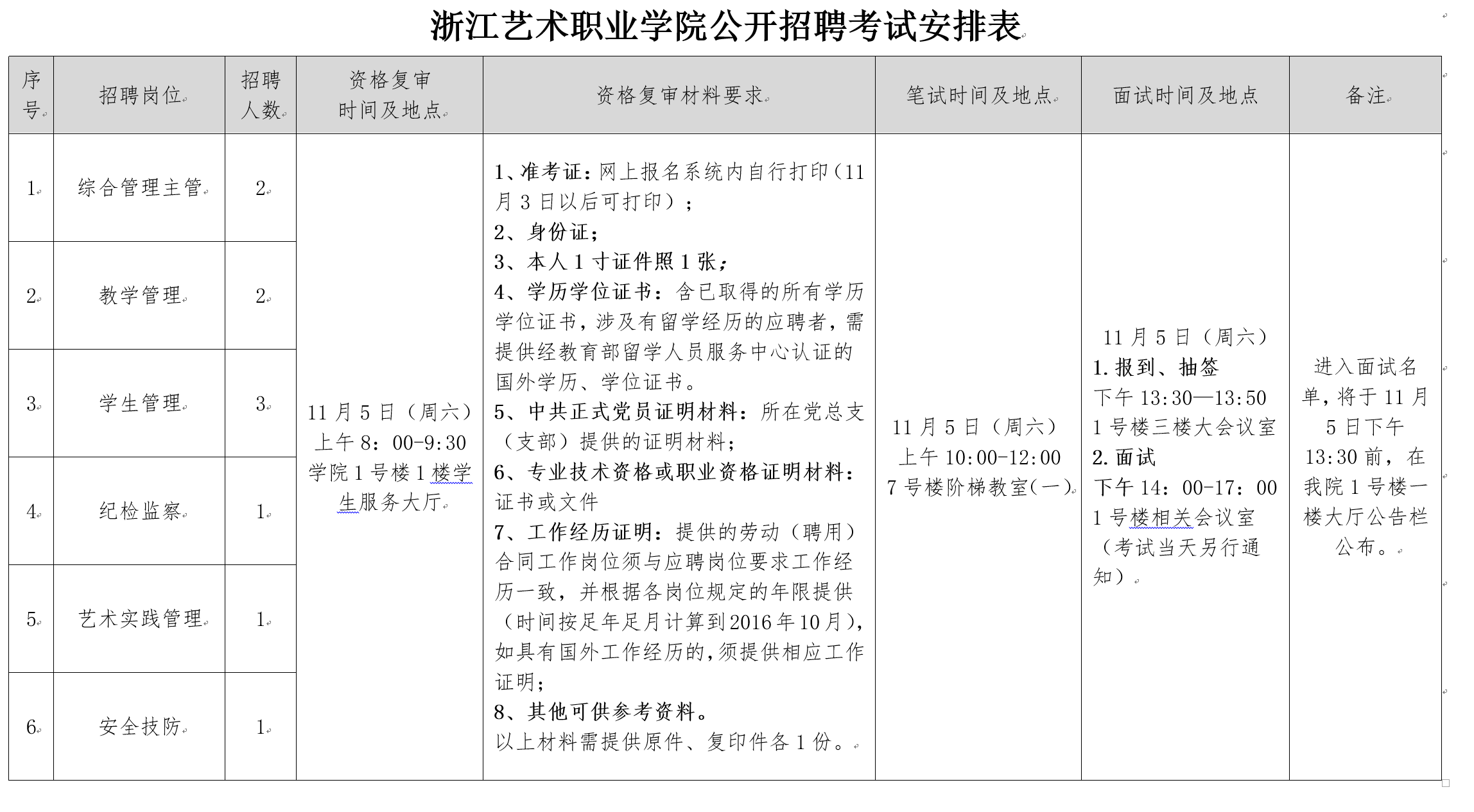 1.资格复审及考试时间:2016年11月5日(周六)全天,具体安排详见附件1《浙江艺术职业学院公开招聘考试安排表》