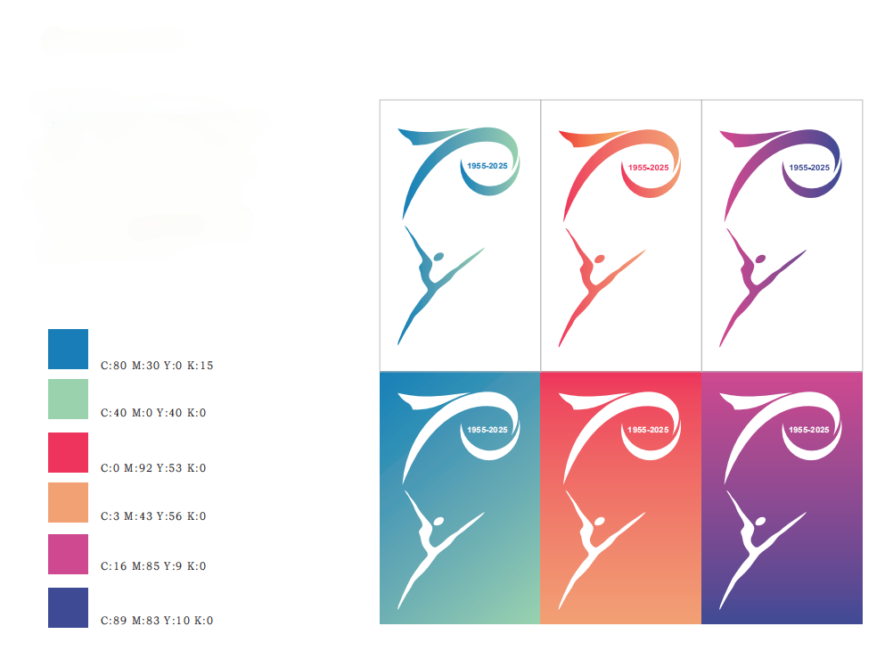 标志配色可采用渐变色彩配置与单色配置两种方式,其中:渐变色彩配置类型有青绿渐变、红黄节庆渐变、篮紫艺术渐变3种,以青绿渐变为主。单色配色采用了蓝、绿、蓝绿色和玫红、正红、群青色进行配置。不同的配色类型可在不同场景中灵活应用。