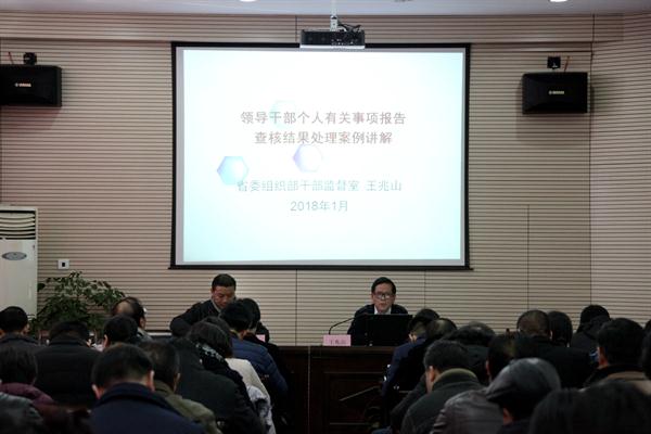 根据我校推进巡视整改工作整体部署,为深入贯彻中共中央办公厅、国务院办公厅出台的《领导干部报告个人有关事项规定》和《领导干部个人有关事项报告查核结果处理办法》“两项法规”精神,做好2018年领导干部个人有关事项报告工作,1月10日下午,我校召开领导干部报告个人有关事项专题培训会,邀请省委组织部干部监督室副主任王兆山专题授课,校领导班子成员、全体科以上干部参加了培训。