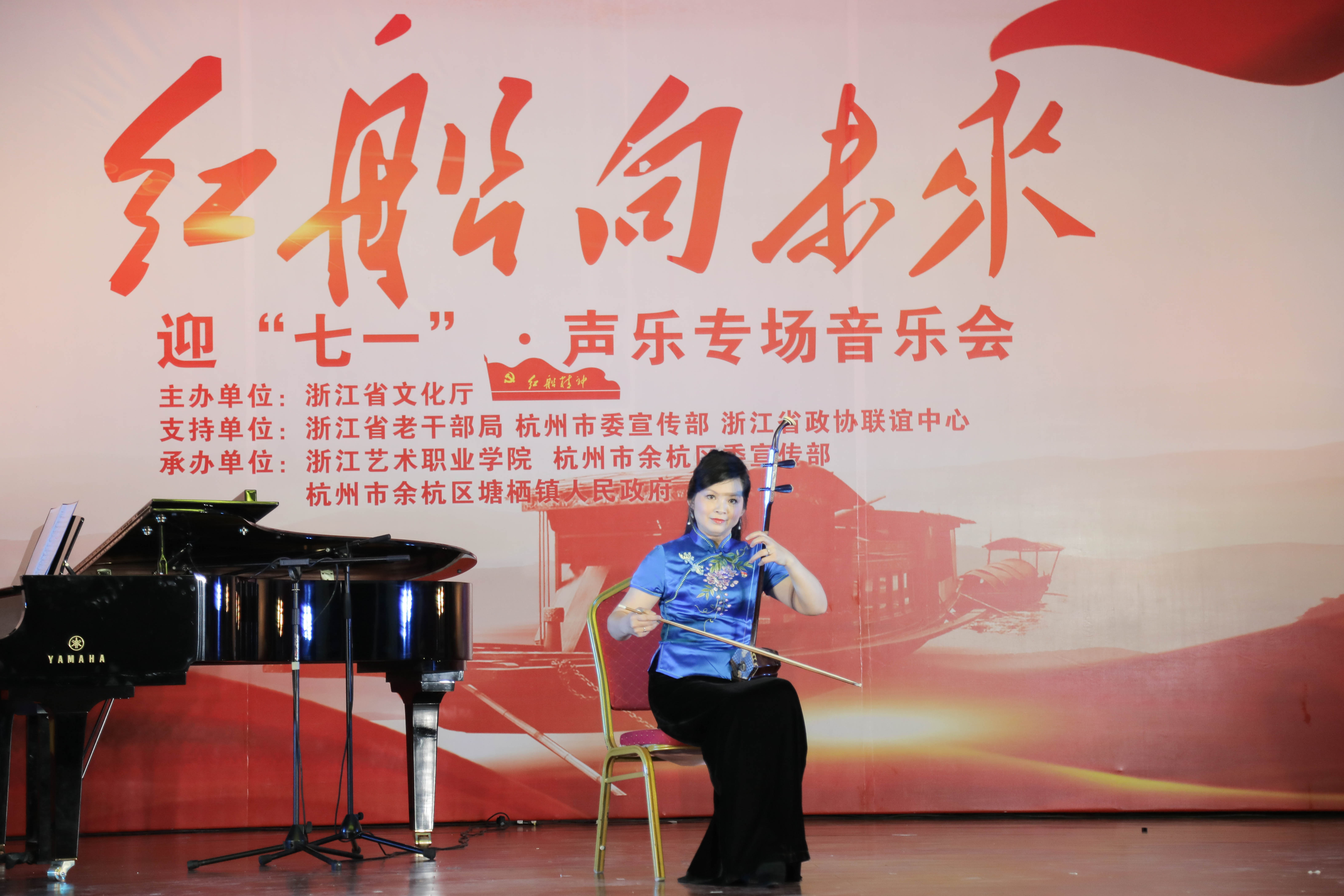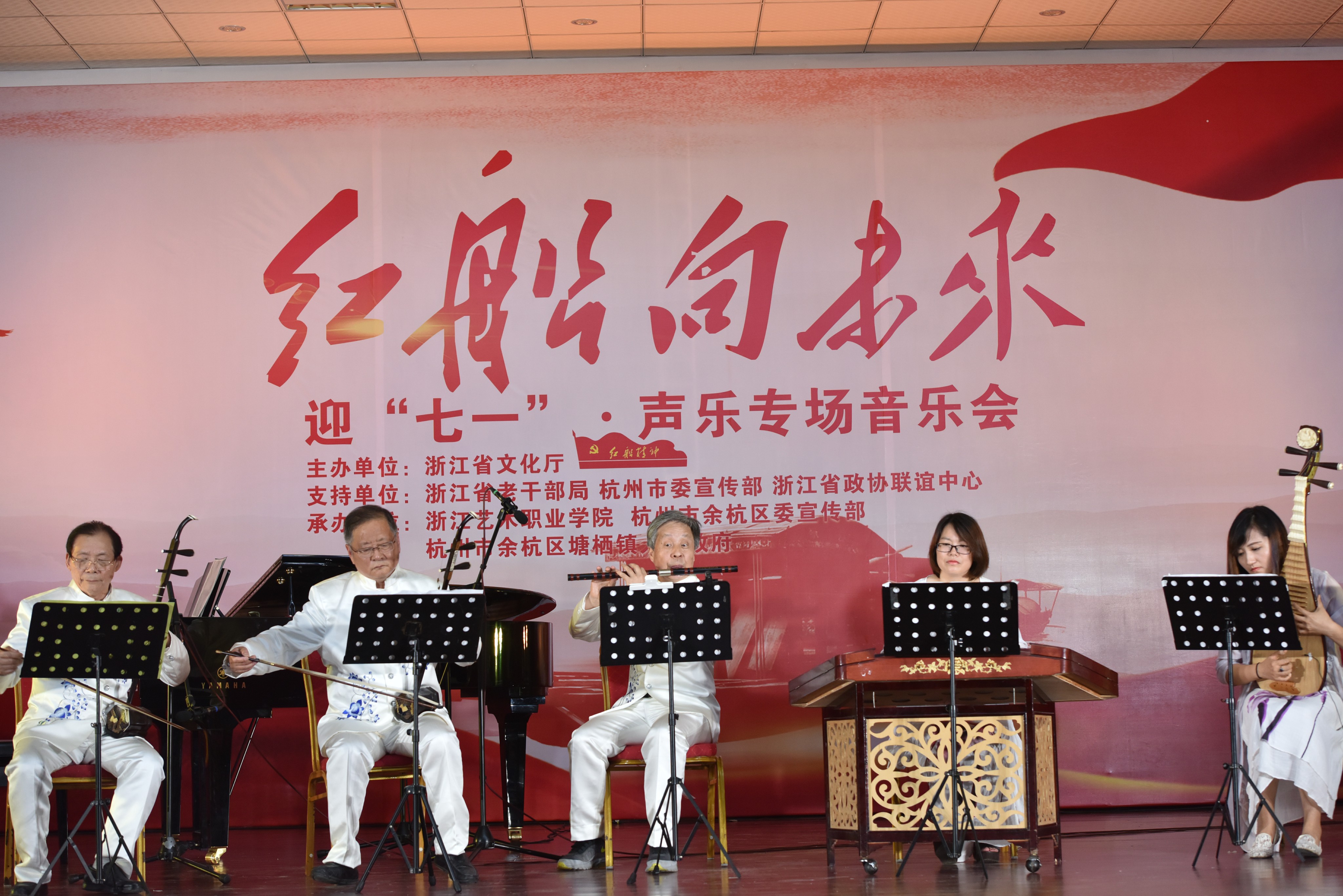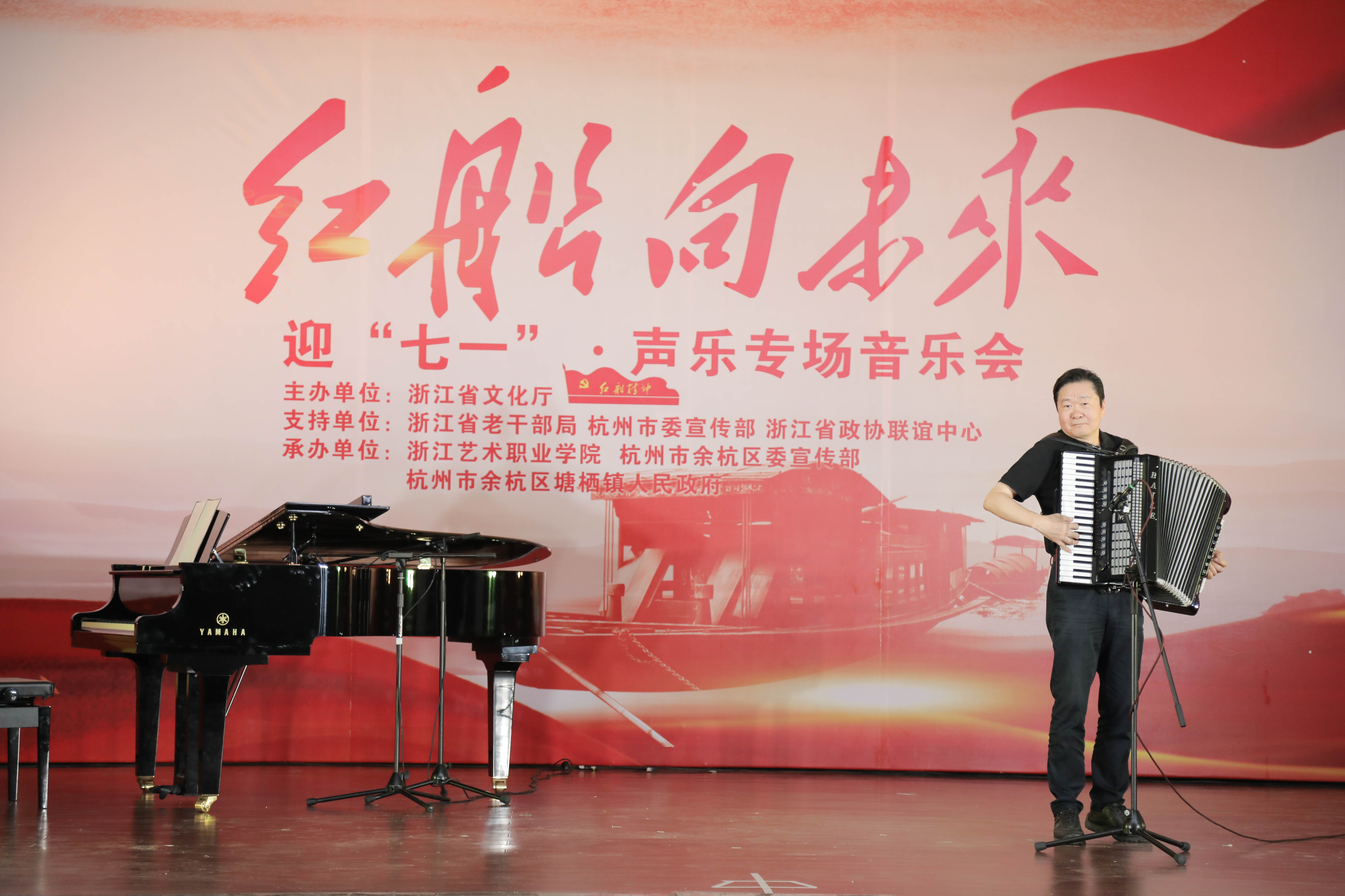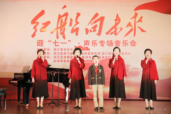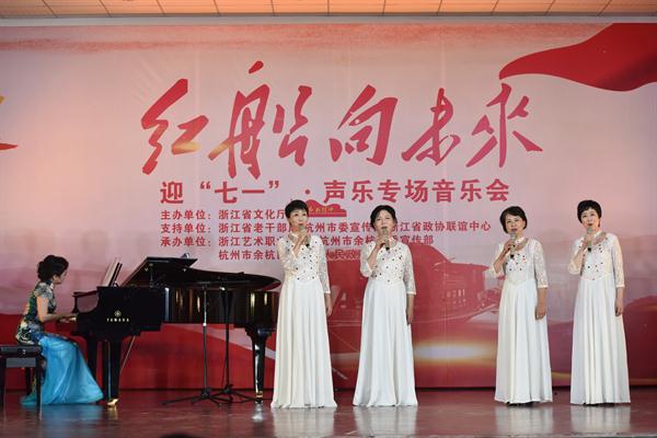 6月23日,为迎接建党97周年,由浙江省文化厅主办,省委老干部局、杭州市委宣传部、省政协联谊中心支持,浙江艺术职业学院、杭州市余杭区委宣传部、塘栖镇人民政府承办的“红船向未来——迎七一声乐专场音乐会”主题党日活动在余杭区塘栖镇塘栖村文化礼堂举行。省人大常委会党组书记、副主任梁黎明,杭州市人大常委会主任于跃敏,省委宣传部常务副部长来颖杰,省委组织部副部长、省委老干部局局长鲍秀英,省文化厅党组书记、厅长褚子育,浙江艺术职业学院党委书记朱海闵、副院长沈恒、音乐系系主任郭义江等出席。来自省直系统有关单位的党员干部、杭州市及余杭区有关领导在现场与村民们一起聆听了这场音乐会。