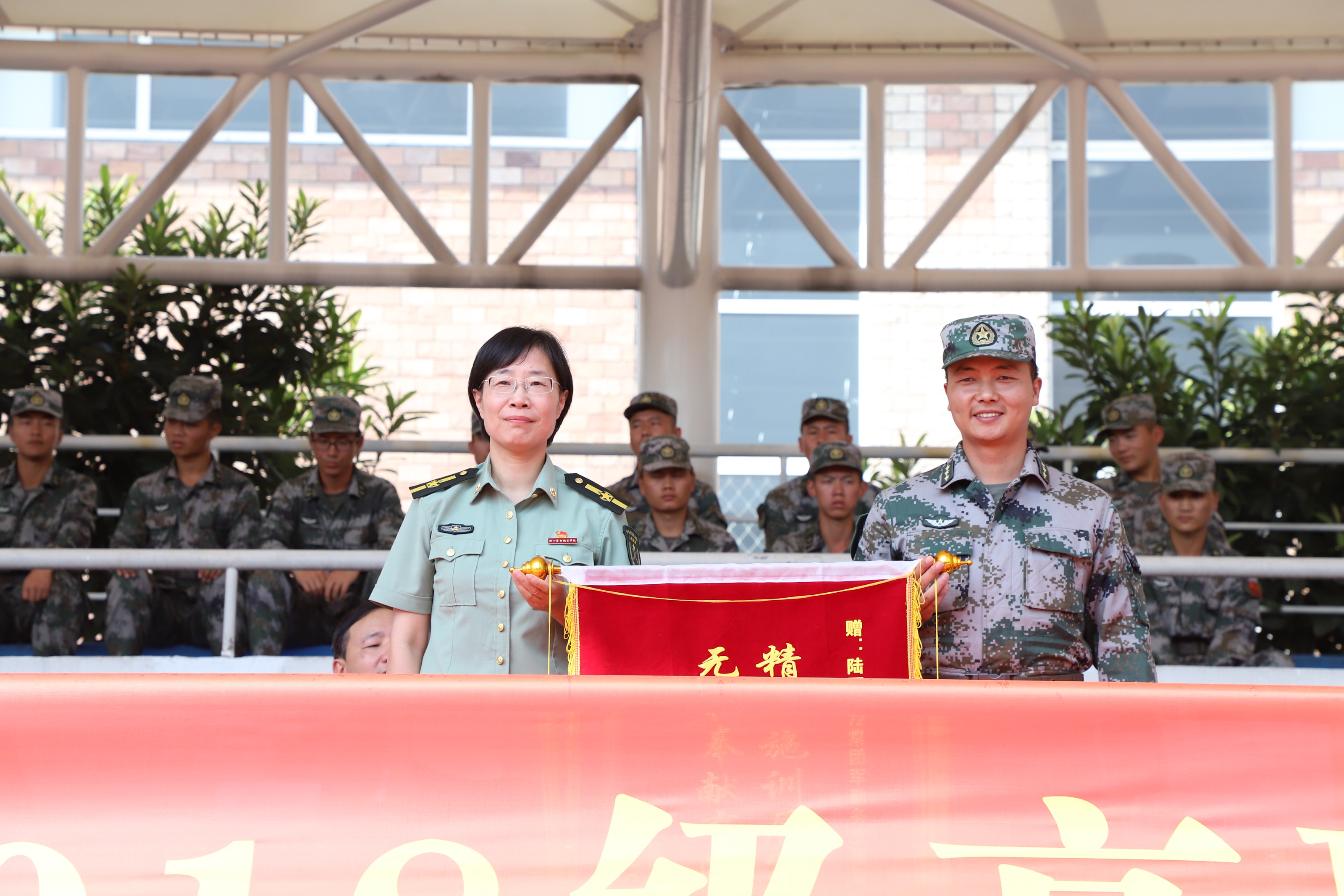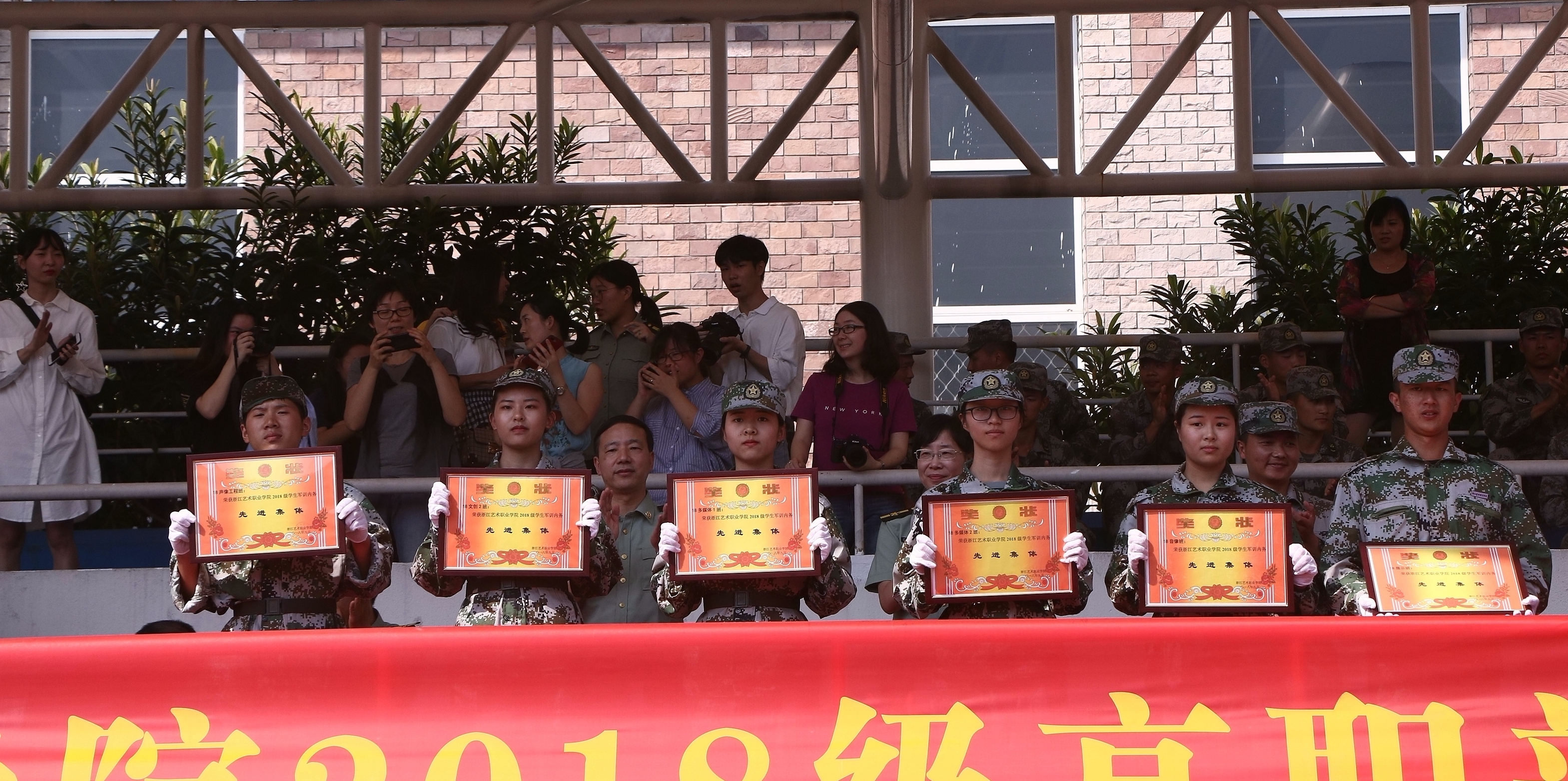 校党委书记朱海闵向承担本次军训任务的陆军某集团军勤务支援某旅陈贝贝副营长赠送锦旗。夏开堂宣布军训先进集体和个人名单。副院长沈恒致闭幕词,向圆满完成此次军训任务,在军训中取得优异成绩的同学们表示衷心的祝贺,希望全体同学自觉将个人的求学梦、成才梦、人生梦融入中华民族伟大复兴的中国梦之中,把军训中学到的好思想、好传统、好作风带到今后的学习、生活中,秉承“求真尚美、精艺修为”校训,做一名德智体美劳全面发展的浙艺人。副院长沈军甫代表学院宣读感谢信,向承训部队官兵表示衷心感谢。