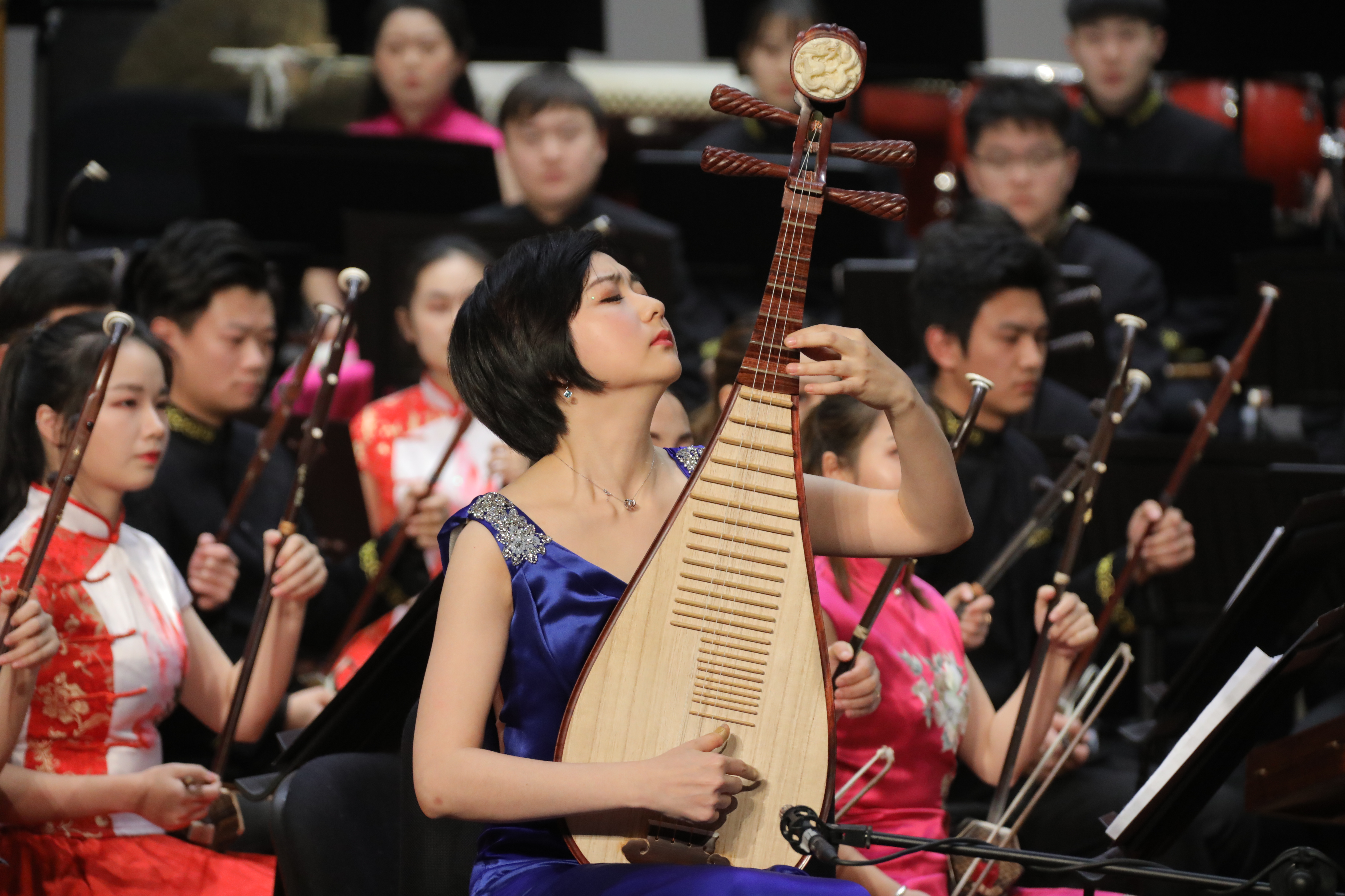 琵琶协奏曲《云想·花想》用唯美的女性化旋律及灵动雀跃的舞蹈性节奏,展现了娓娓道来的深切情思。担任琵琶独奏的青年教师张凌曾获2015年浙江省“新松计划”青年演奏员大赛一等奖等专业赛事佳绩,并于2018年10月成功举办了“新松计划”琵琶专场音乐会。