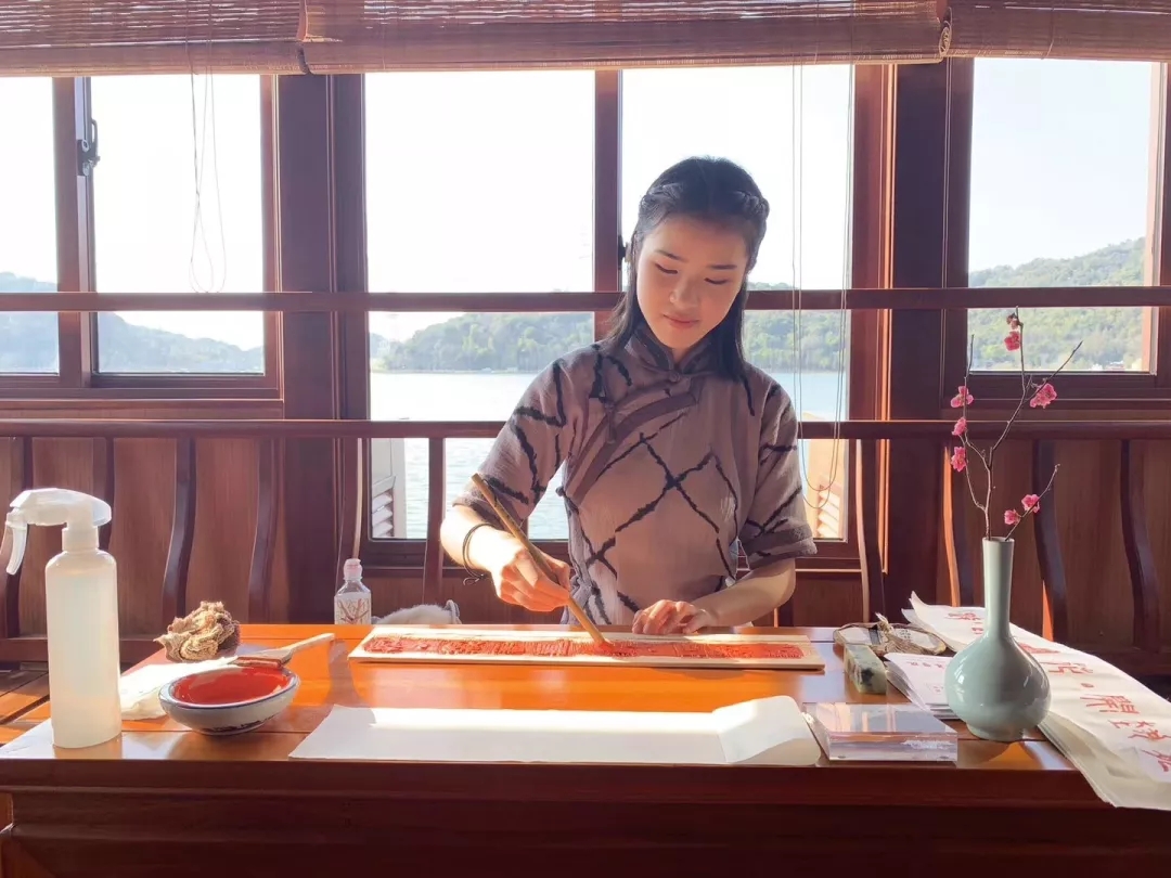 游船上,浙艺文化管理系学子表演水印和香道