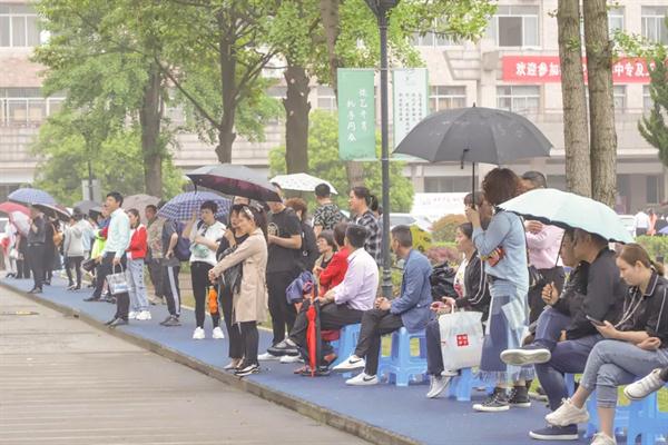 4月20日早上八点,学校附中楼、图信中心、音乐楼陆陆续续来了许多考生与家长,考生有序排队进场,家长们守候在外。天空飘起了雨滴,许多家长撑着伞等候,寸步不离。