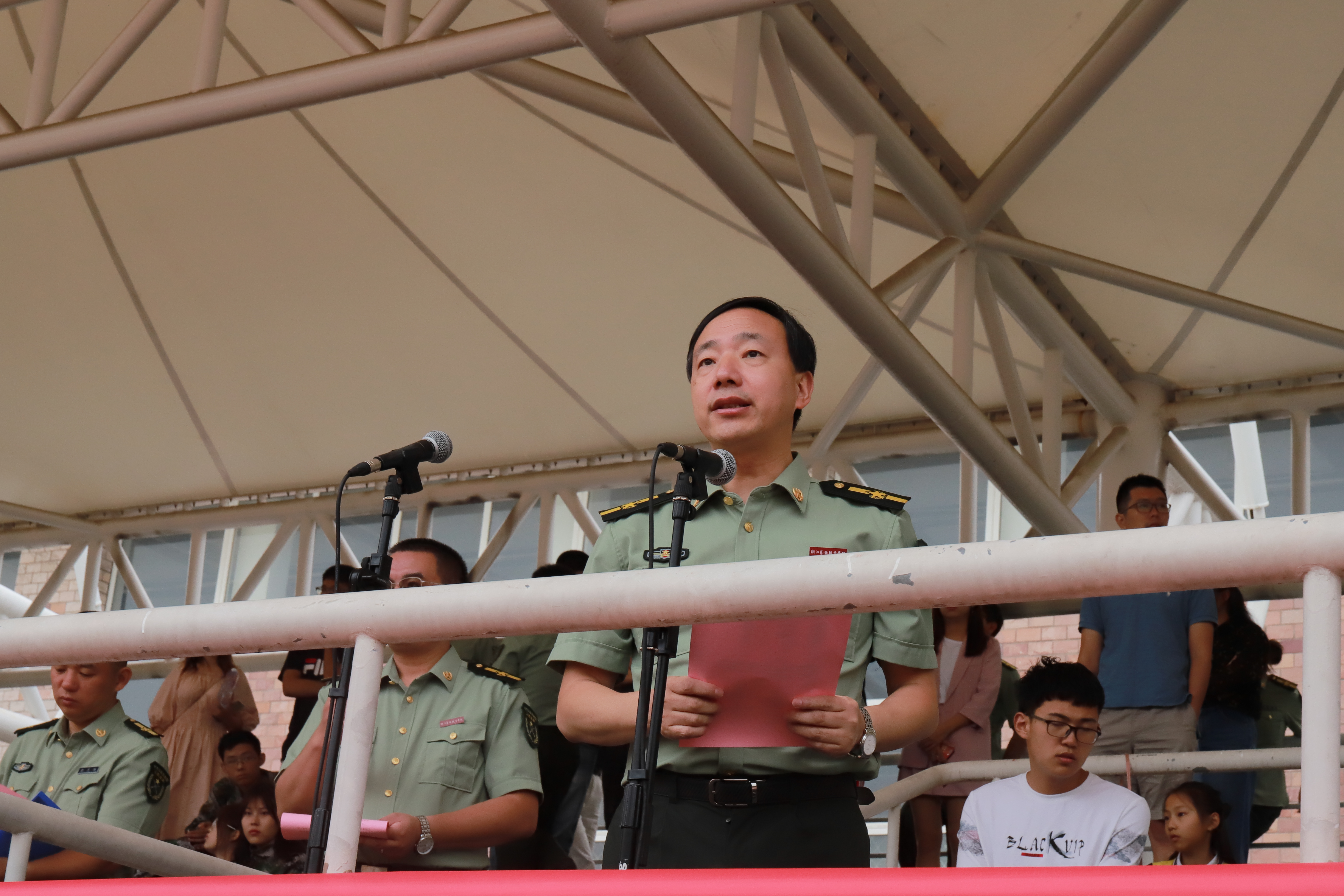 夏开堂宣读军训先进个人和先进集体名单,对新生进行了检阅。