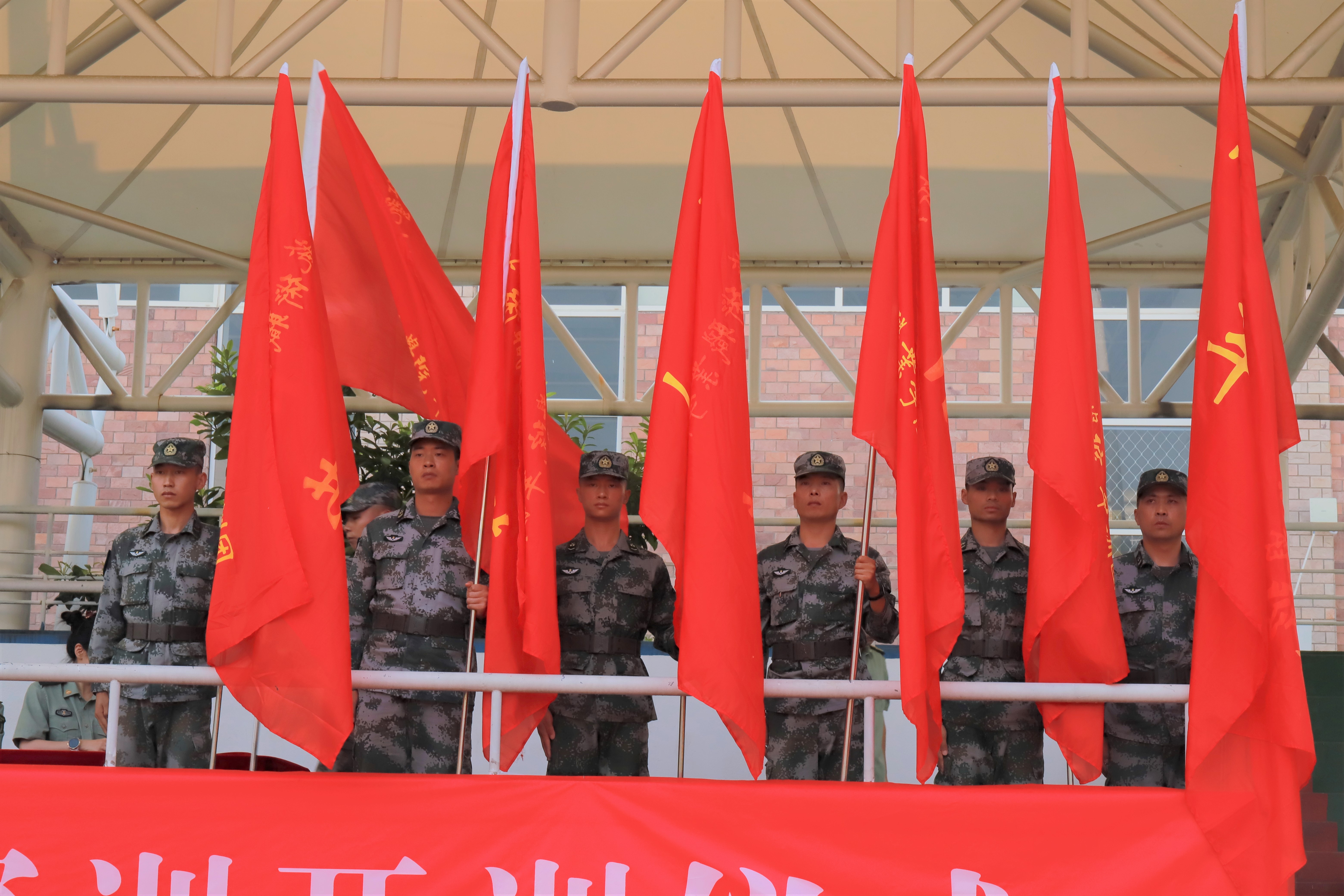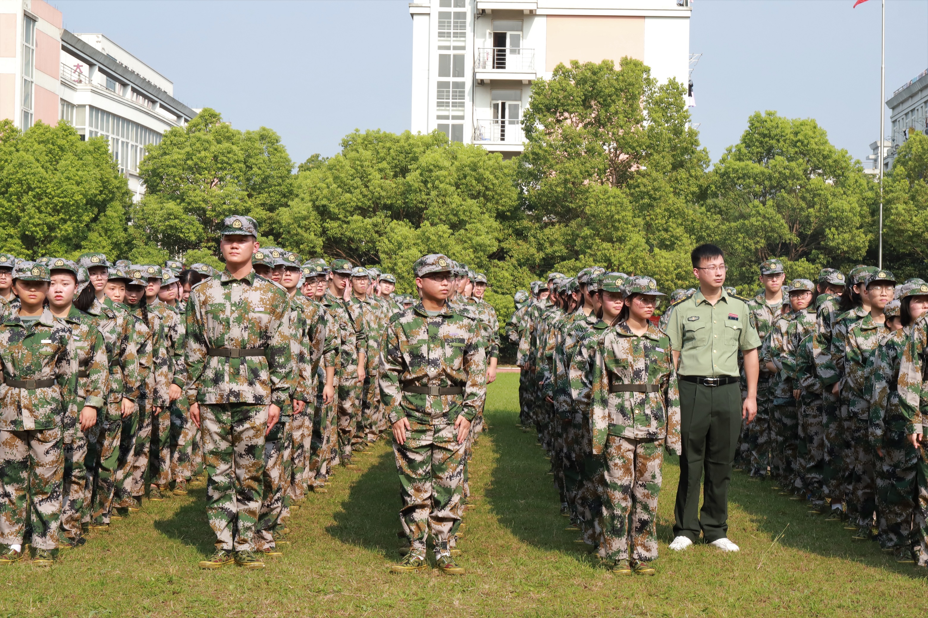 黄杭娟讲话。她向承担今年军训工作的中国人民解放军某部队及各位官兵致以崇高敬意和衷心感谢,对跨入我校学习的1108名新同学表示热烈祝贺。学校开展军事训练,是大学生在校期间接受国防教育、树立爱国主义、集体主义和革命英雄主义的一个基本形式,是我国国防和军队建设培养大批高素质后备人才的有效举措。一直以来,我校非常重视大学生的军训工作,邀请经验丰富的承训部队,精心安排训练计划,细致做好各项服务,每届参训学生的政治觉悟、理想信念、思想品德、作风纪律、军事技能、国防观念、身体素质等各方面都得到了锻炼和提高。黄杭娟对新生们提出三点希望:提高认识,居安思危,牢固树立保家卫国的国防意识;严明纪律、听从指挥,牢固树立令行禁止的纪律意识;端正态度,自立自强,牢固树立互帮互助的团队意识。