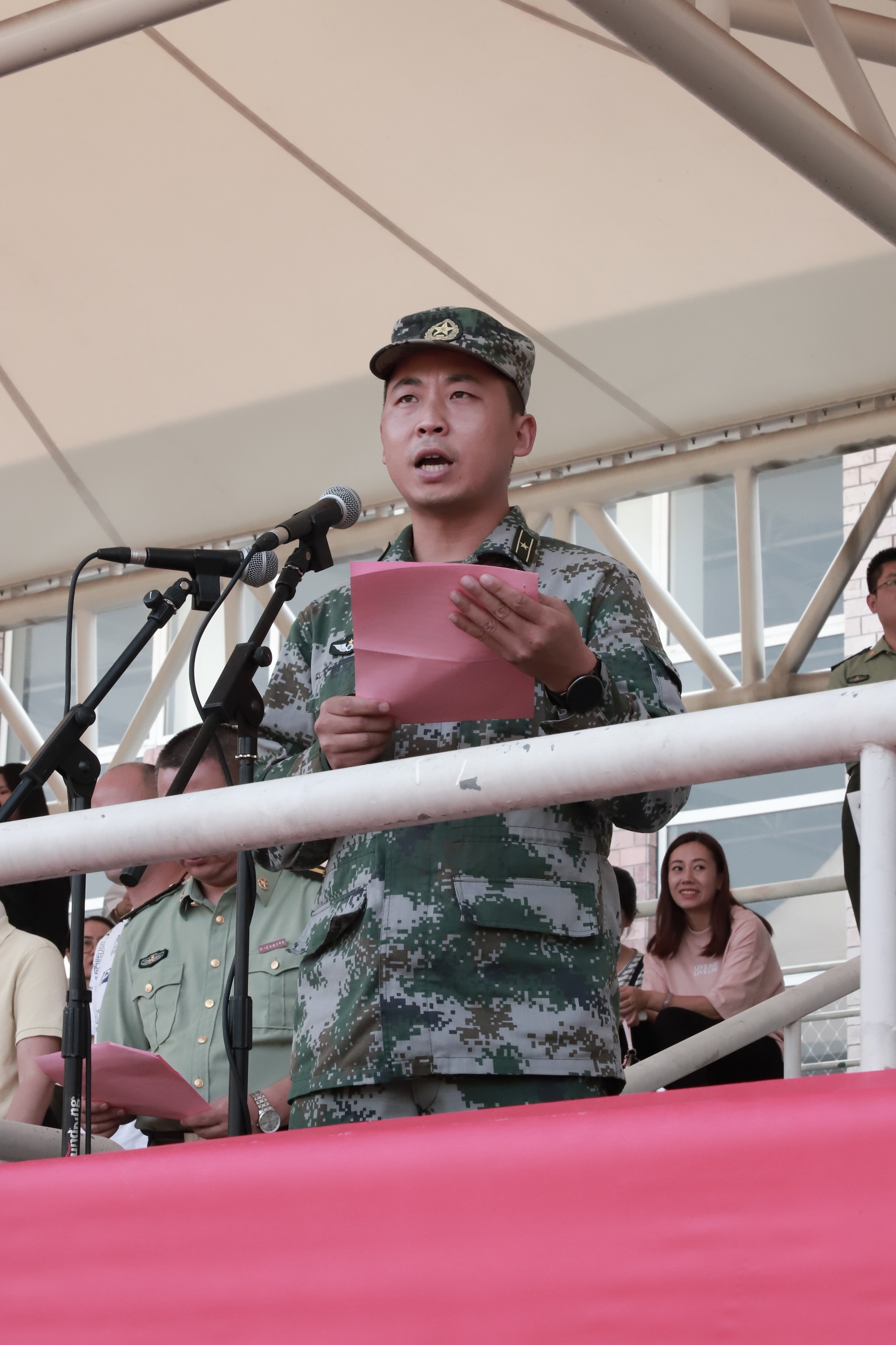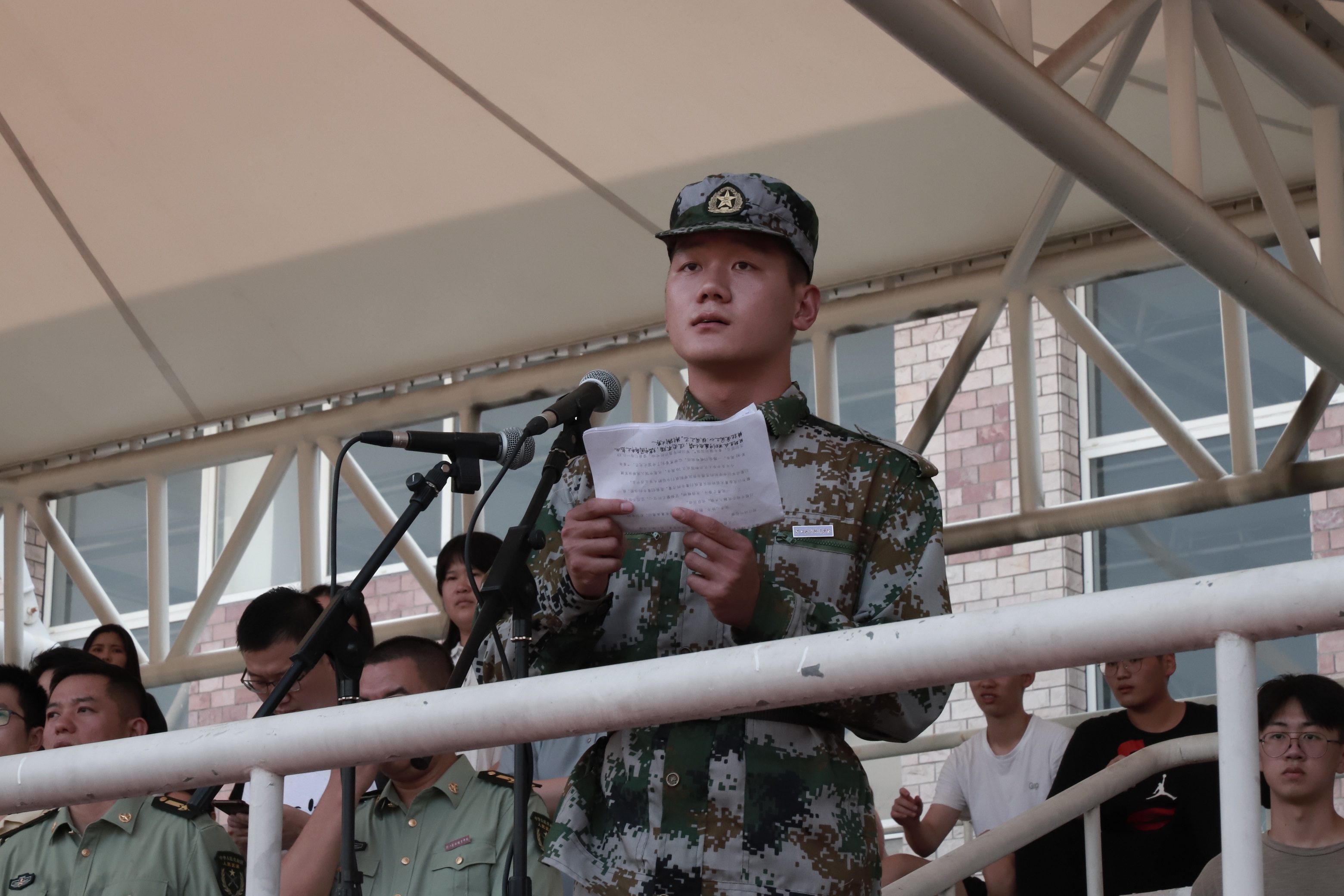 2019级音像班赵景晨作为受训学生代表发言。他讲述了自己两年部队生活的心得体会,并对此次军训做出承诺,服从命令,齐心协力,将小我融入大我,勇于奋斗。