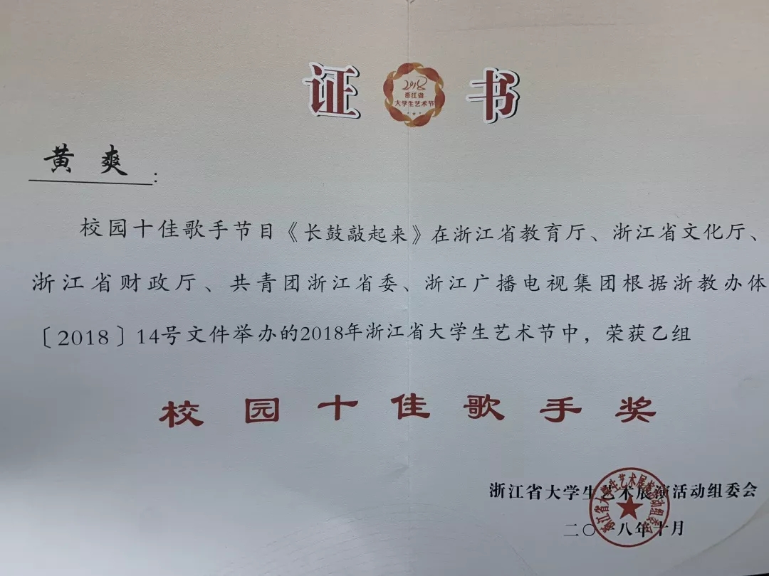 2018年浙江省大学生艺术节”校园十佳歌手奖;