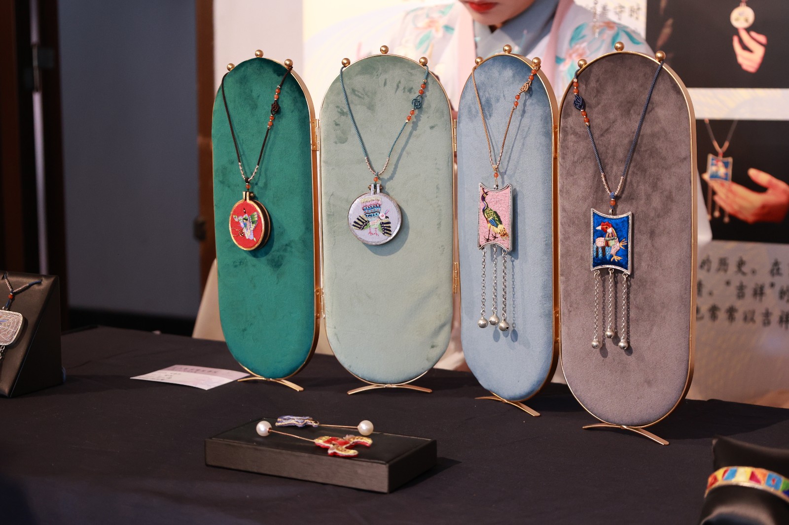 吉祥鸟的吉祥刺绣首饰系列作品,选取了公鸡、孔雀和蝴蝶图案进行了现代艺术手法表现,增添了其趣味性和装饰性。