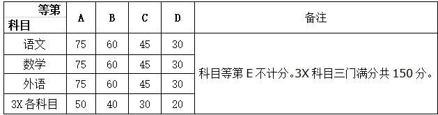 学业水平考试成绩由语文、数学、外语三门中任选两门最优等第科目及3X科目共五门科目成绩组成。3X科目是指除语文、数学、外语外,另7门学业水平考试科目中任选三门最优等第科目。往届生的技术科目成绩由通用技术和信息技术两科成绩中选最优科目等第计入总分。具体成绩折算方法如下: