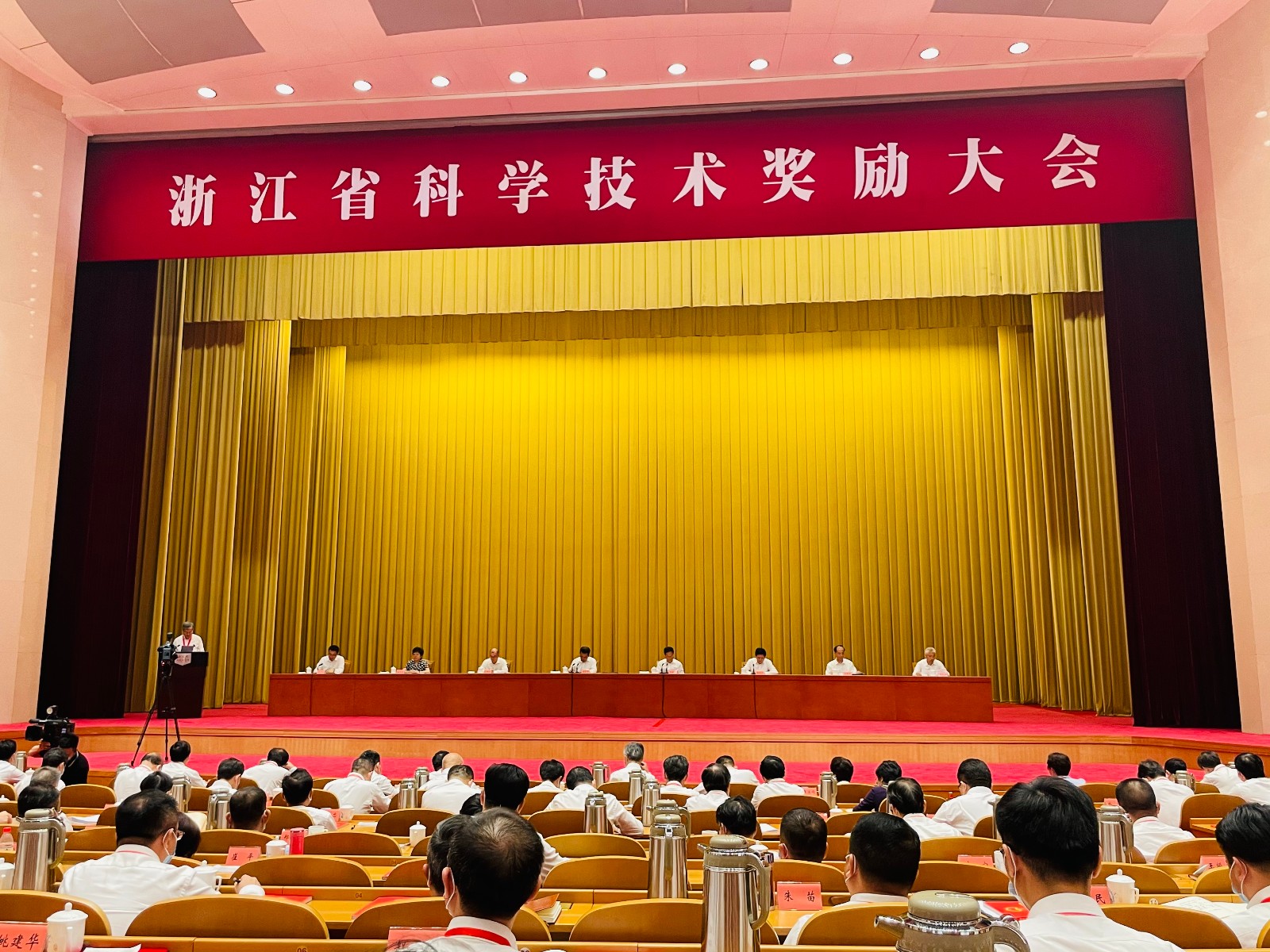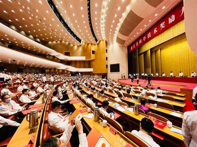 6月15日下午,浙江省科学技术奖励大会在省人民大会堂举行。省委书记、省人大常委会主任袁家军,省委副书记、省长郑栅洁出席大会。在热烈的掌声中,袁家军向2020年度浙江科技大奖获得者、中国工程院院士潘云鹤颁奖。与会省领导还为2020年度省科学技术奖一等奖第一完成人、科技创新鼎获奖单位、第六批省特级专家代表、西湖友谊奖获奖专家代表等颁奖授牌。