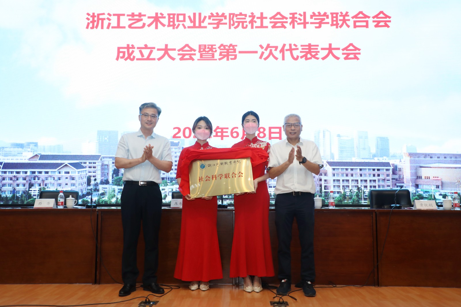 陈先春、薛亮为“浙江艺术职业学院社会科学联合会”揭牌。