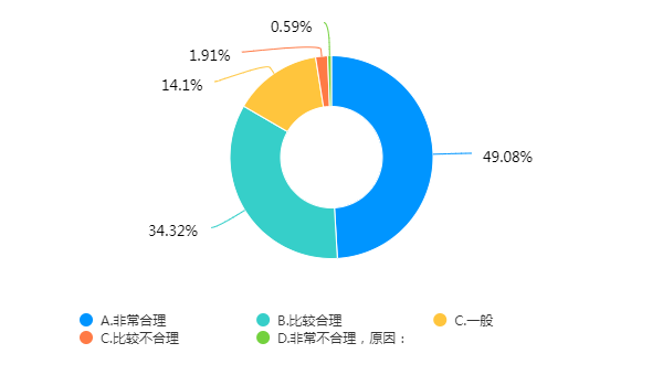 专业课程开设的合理性。52.03%的学生认为很合理,33.31%的学生认为比较合理,认为一般、不太合理或很不合理的学生分别占12.16%、1.39%、1.11%。