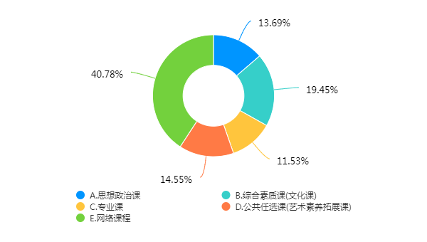 满意度最高和最低的课程类别。66.66%的学生对专业课程满意度最高,40.78%的学生对网络课程满意度最低,说明线上课程提升空间仍然很大,学校仍需注重信息化条件的教学改革,进一步激励教师建设高质量精品在线开放课程。