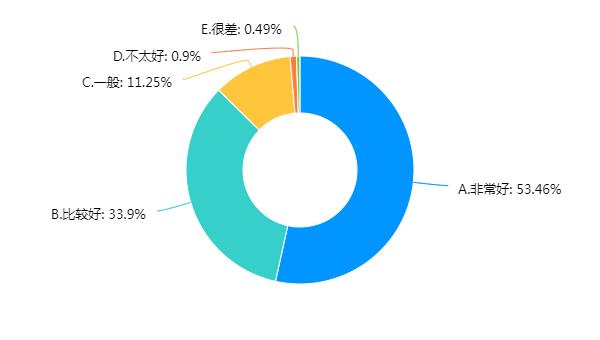 课堂教学及实践教学的总体质量。大部分学生非常认可学校课堂教学及实践教学,有53.46%的学生认为非常好,33.9%的学生认为比较好。认为一般、不太好或很差的分别占11.25%、0.9%、0.49%。