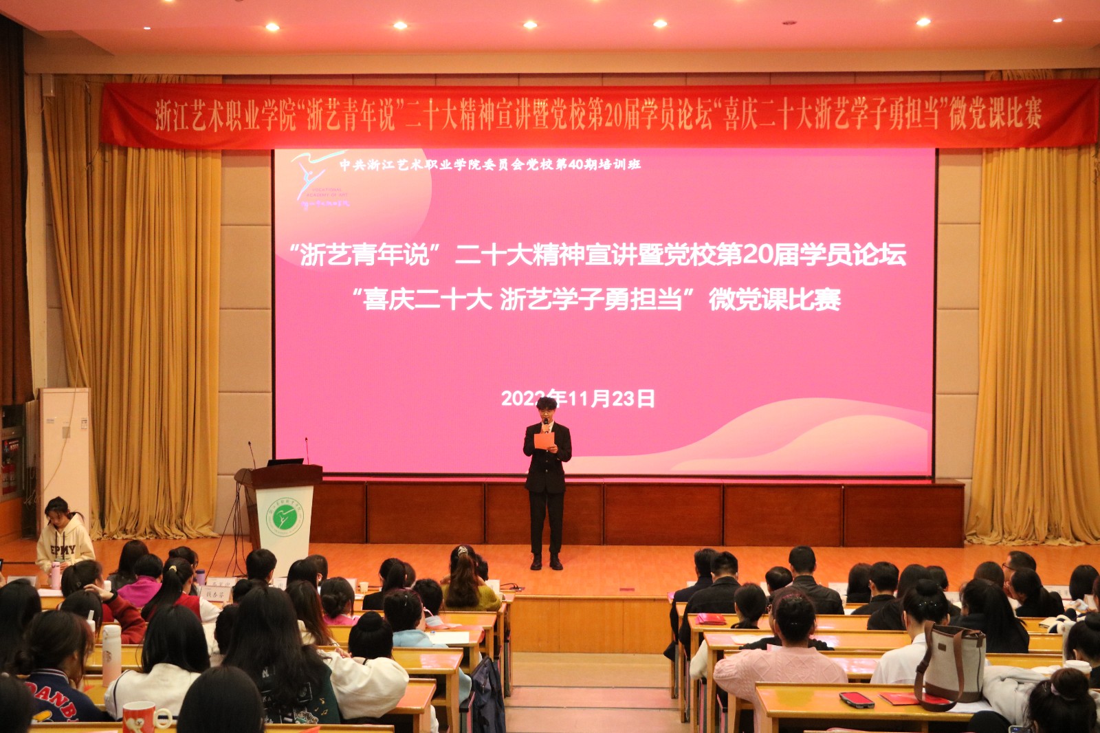 “浙艺青年说,今天我来说!增强中华文明传播力、影响力,坚守中华文化立场,讲好中国故事、传播好中国声音,展现可信、可爱、可敬的中国形象,推动中华文化更好的走向世界……”11月23日,由校党委宣传部、马克思主义学院、校团委联合主办的“浙艺青年说”党的二十大精神专题宣讲会在图信中心报告厅举行。党委书记薛亮,党委委员、副院长沈军甫,党委委员、宣传部(统战部)部长马向东,党委委员、组织部(人才办)部长刘杨,相关职能部门和各二级学院党总支负责人、党校培训班师生听取宣讲。