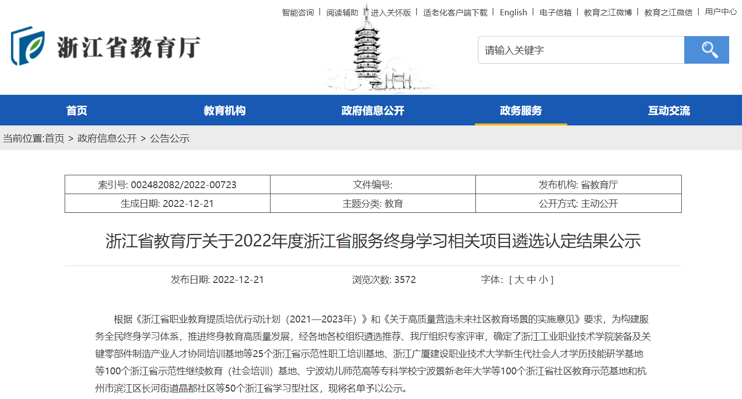 为构建服务全民终身学习体系,推进终身教育高质量发展,12月21日,浙江省教育厅公布2022年度浙江省服务终身学习相关项目遴选认定结果,浙江艺术职业学院申报的两个项目成功入选,其中文旅人才继续教育(社会培训)基地入选浙江省示范性继续教育(社会培训)基地,“青春文旅志愿行”社区教育基地入选浙江省社区教育示范基地。
