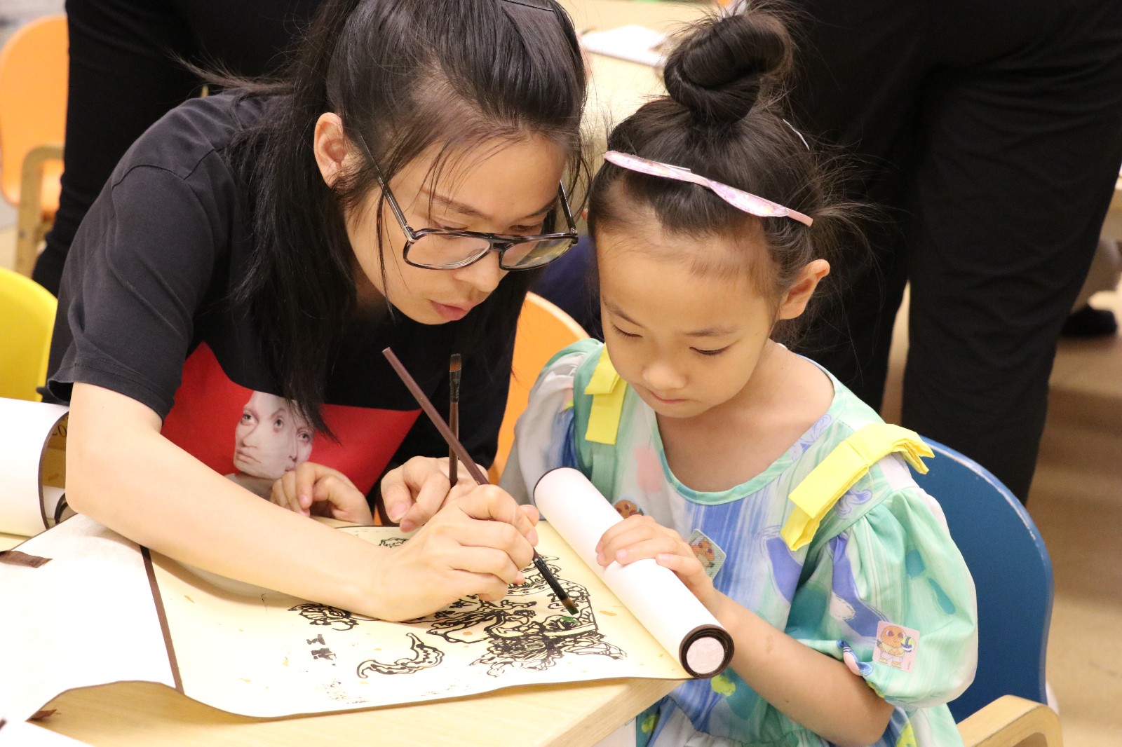 在水印木刻体验中,“艺小匠”详细讲解了水印木刻的印制流程及印制工具。在“艺小匠”的指导下,参与体验的小朋友们将蘸取墨水的刷子在木板上刷色,均匀涂抹版面,观察好版面的位置后把宣纸对准印版平铺,借助马莲来回旋转按压,使纸面和版面上的墨充分接触。