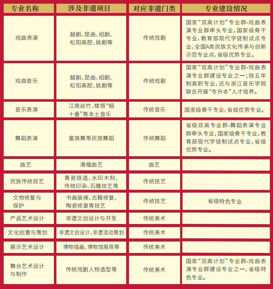 “无论是在教学专业设置还是在科研方面,浙艺都进行了大量投入,成为浙江省非遗保护传承的一个高地。”薛亮介绍,浙艺现在32个高职专业中有非遗相关专业11个,其中国家“双高计划”专业群建设专业专业就占了3个,此外,还有1个浙江省“双高”专业群建设专业,1个全国A类民族文化传承与创新示范专业点,3个国家级骨干专业,3个教育部现代学徒制试点专业,以及3个省级优势专业和1个省级特色专业,不仅涉及越剧、昆曲、绍剧、松阳高腔、姚剧等传统戏曲,还包括江南丝竹、楼塔“细十番”等本土音乐、畲族舞等民族舞蹈,以及青瓷烧造、水印木刻、传统印染、石雕、书画装裱、古籍修复、陶瓷修复等传统技艺,涉及传统戏剧、传统音乐、传统舞蹈、曲艺、传统技艺和传统美术的六大非遗门类。